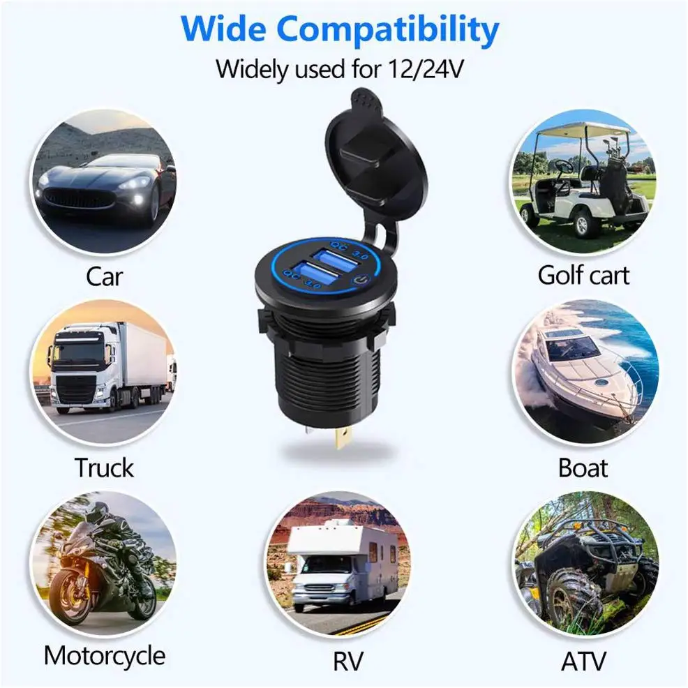 Многофункциональный USB-разъем для быстрой зарядки 3,0 с выключателем. Подходит для автомобилей 12-24 В, лодок, морских судов, мотоциклов, грузовиков, квадроциклов, фургонов и т. д. Подходит для зарядки мобильных телефонов, планшетов, GPS, цифровых камер, КПК и других USB-аксессуаров. Автомобильный набор «все в одном». Может устанавливаться вертикально, горизонтально, под приборной панелью или на любой плоской поверхности.