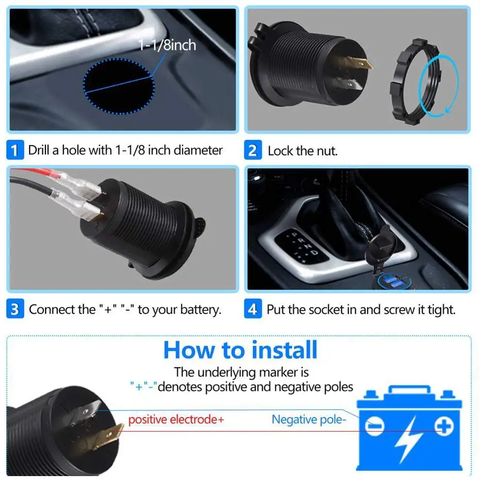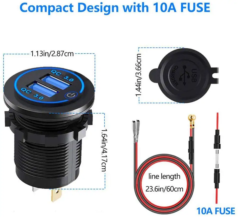 Многофункциональное Быстродействующее зарядное устройство 3,0 USB с выключателем. Подходит для автомобиля 12-24 В, лодки, моря, мотоцикла, грузовика, ATV, RV и т. д. Подходит для зарядки мобильных телефонов, планшетов, GPS, цифровых камер, КПК и других аксессуаров USB. Универсальный автомобильный набор DIY. Может устанавливаться вертикально, горизонтально или под приборной панелью или любой плоской поверхностью.