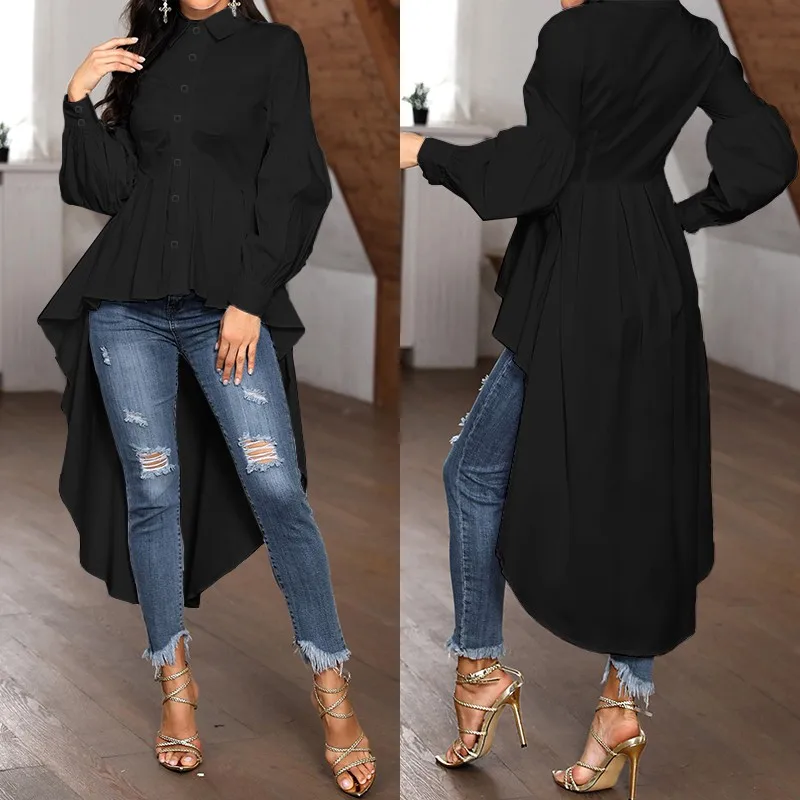 Модная женская рубашка с оборками на подоле, элегантная рубашка с воротником с лацканами в стиле Махаон, однотонные топы с длинными рукавами и высокой талией, нестандартные Блузы