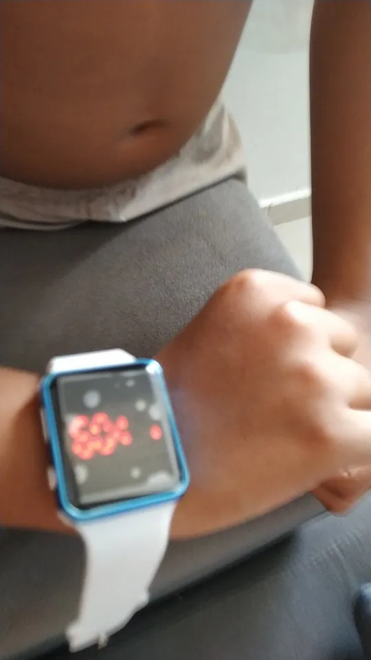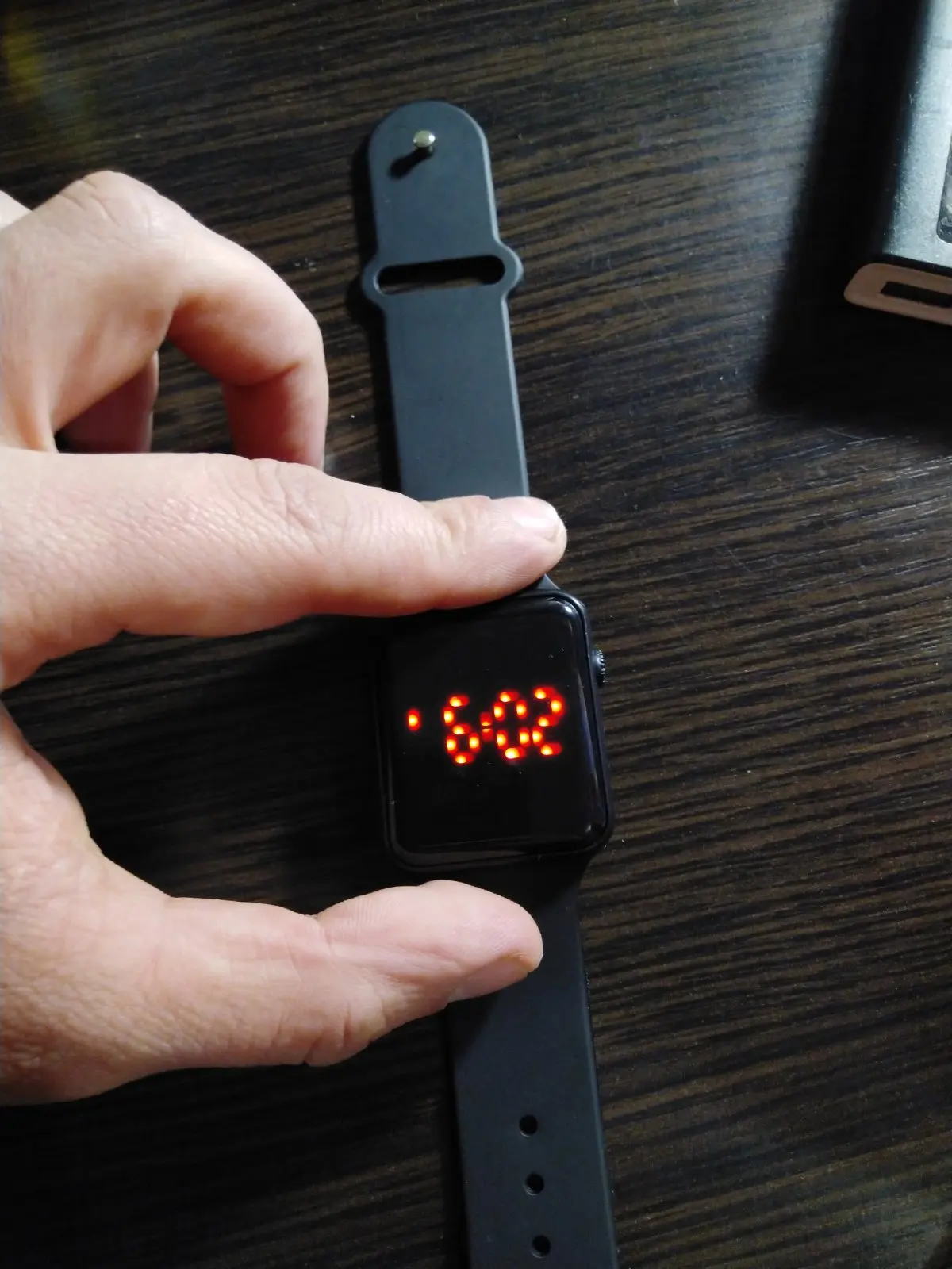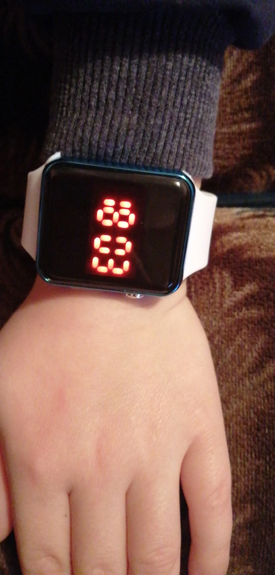 ребёнок довольно, красивый дизайн, на чёрном циферблате время показывают крупными красными цифрами
