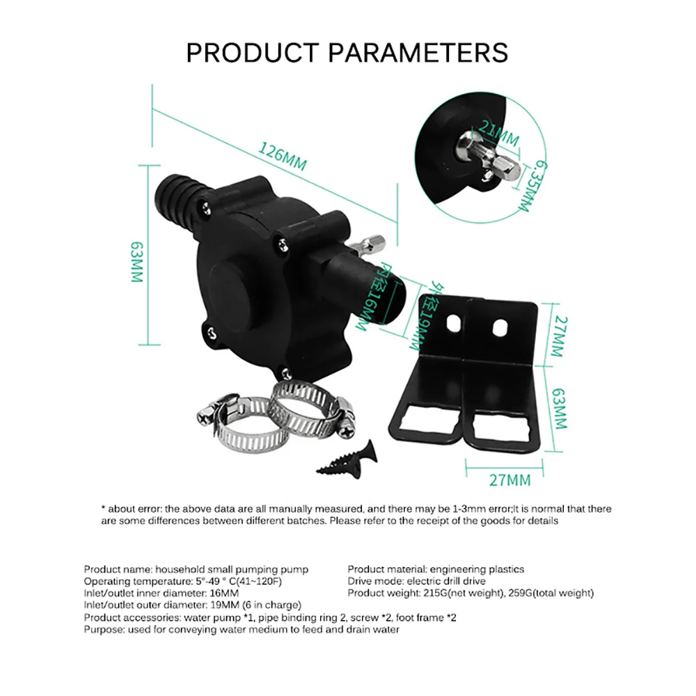 Прочный Водяной насос изготовлен из высококачественного пластика, который отличается прочностью, устойчивостью к коррозии, термостойкостью и долговечностью, обладает длительным сроком службы. Нет требования к питанию Водяной насос с шестигранным хвостовиком 6,35 мм питается от ручной дрели, которая может работать без электрического кабеля по своему усмотрению. Интерфейс в форме башни Водяной насос имеет интерфейс в форме башни, который не скользит и не протекает, надежен в использовании. Гарнитура Водяной насос можно закрепить винтами, чтобы освободить две руки, что более удобно в эксплуатации. Сфера применения Водяной насос хорошо переносит воду, подходит для рыболовного резервуара, улицы, сада, мойки автомобилей и так далее. Спецификация: Тип: водяной насос Количество: 1 шт. Материал: пластик Цвет: черный Рабочая температура: 5-49 градусов Цельсия/41-120 по Фаренгейту Входной диаметр: 1,6 см/0,63 дюйма Выходной диаметр: 1,9 см/0,75 дюйма Размер шестигранного хвостовика: 2,1*0,635 см/0,83*0,25 дюйма (Д * Г) Размер подножки: 6,3*2,7*2,7 см/2,48*1,06*1,06 дюйма (Д * Ш * В) Размер: 12,6*1,9*6,3 см/4,95*0,75*2,48 дюйма (Д * Ш * В) Вес нетто: 215 г/7,58 унции Посылка: 1 водяной насос 2 кольца с пряжкой 2 винта 2 держателя для ног