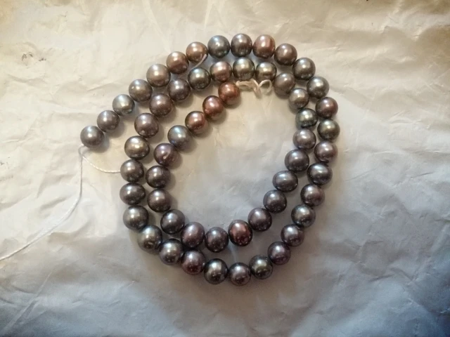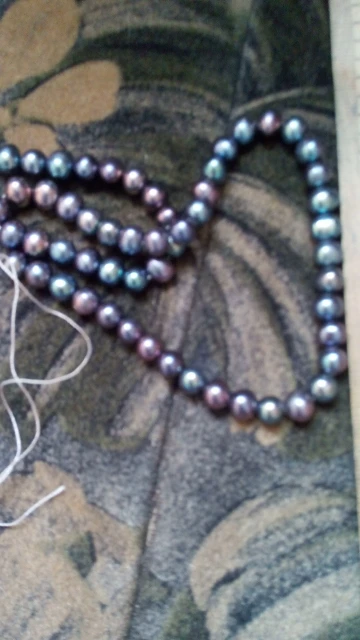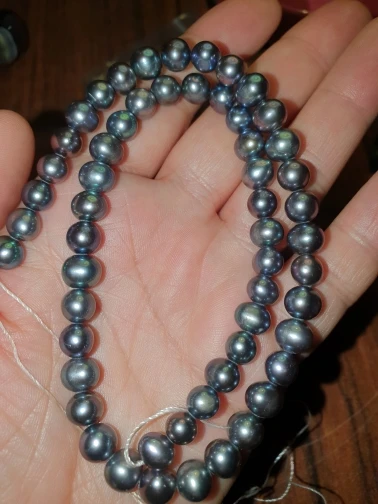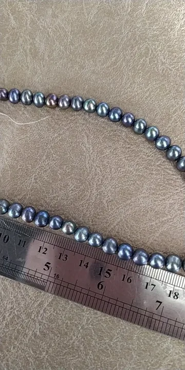 Жемчуг действительно натуральный, но размер меньше 7 мм. На нитке длиной 37.7 см 51 жемчужинка. Если приглядеться, то много склеенных половинок. А если не приглядываться, то выглядят неплохо, хоть и не так красиво, как на видео продавца. На видео бусинки намного крупнее и темнее.