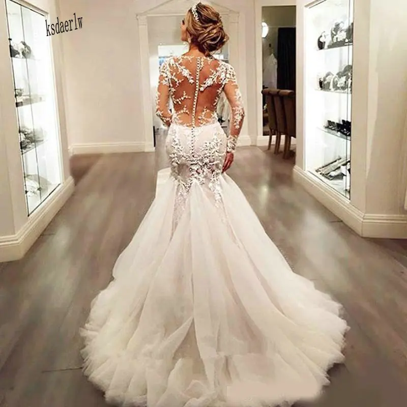 Свадебные платья русалки в стиле кантри 2019, прозрачные длинные кружевные аппликации с рукавами, прозрачные сзади, винтажные платья