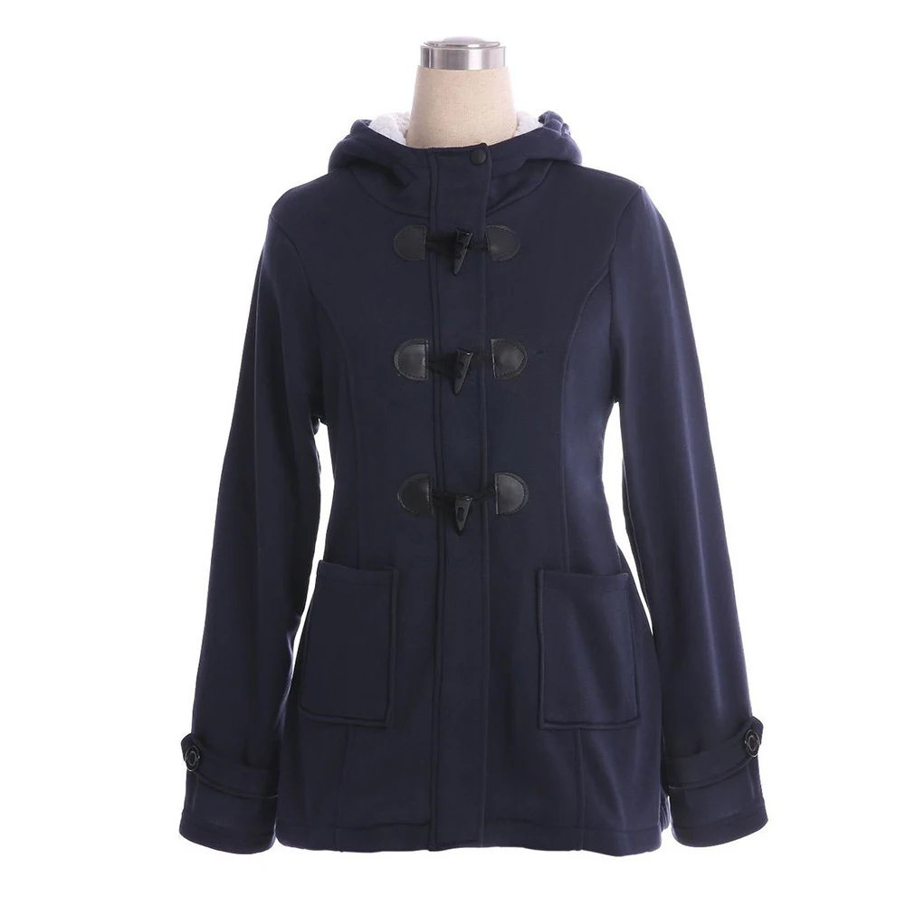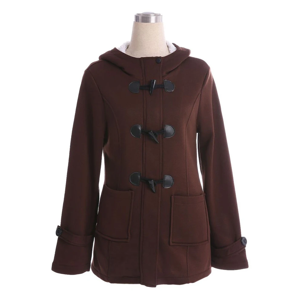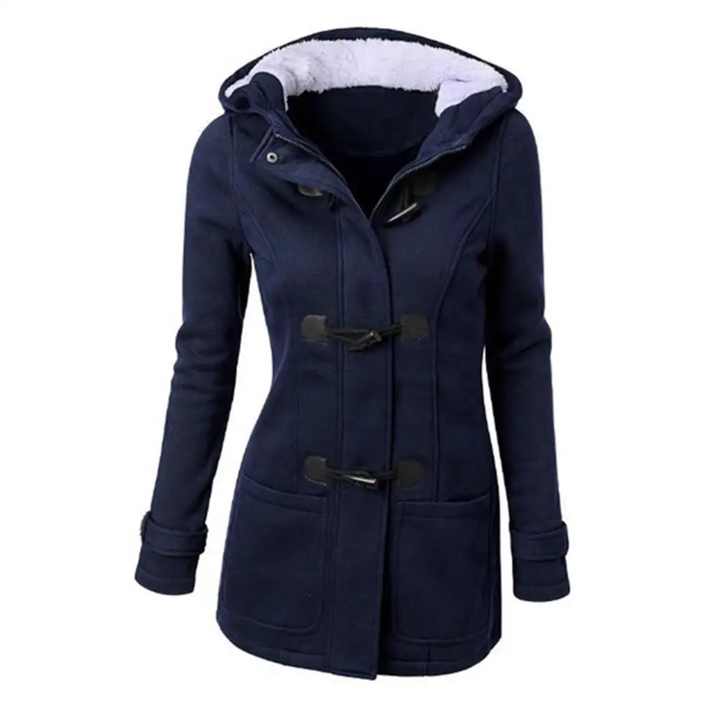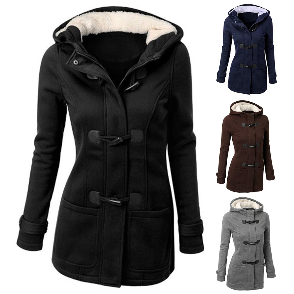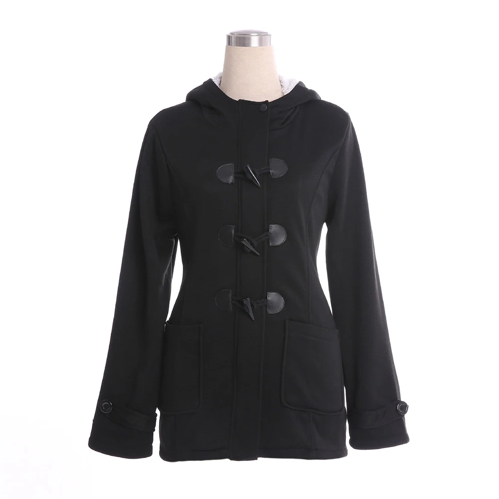 Женское пальто с капюшоном размера плюс, однотонное пальто с длинным рукавом и роговой пряжкой, подходит к подаркам, зима