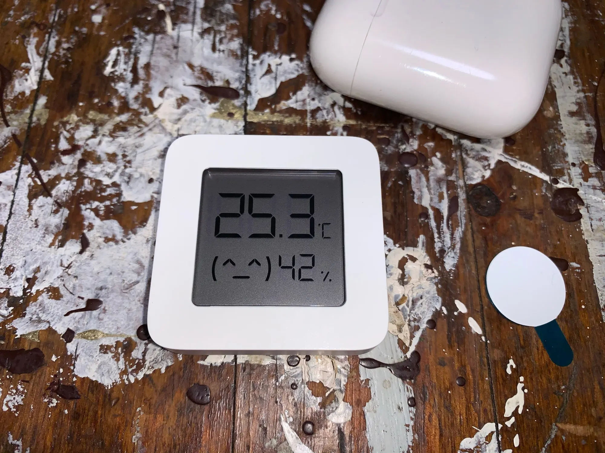 Измеритель температуры и влажности работает из коробки, никаких настроек не требуется, маленький, лёгкий, в комплекте батарейка и круглое клейкое крепление для установки на стене (двусторонний скотч). Точность показаний сравнить не с чем, первый прибор такого рода.