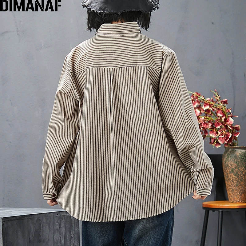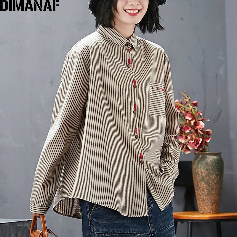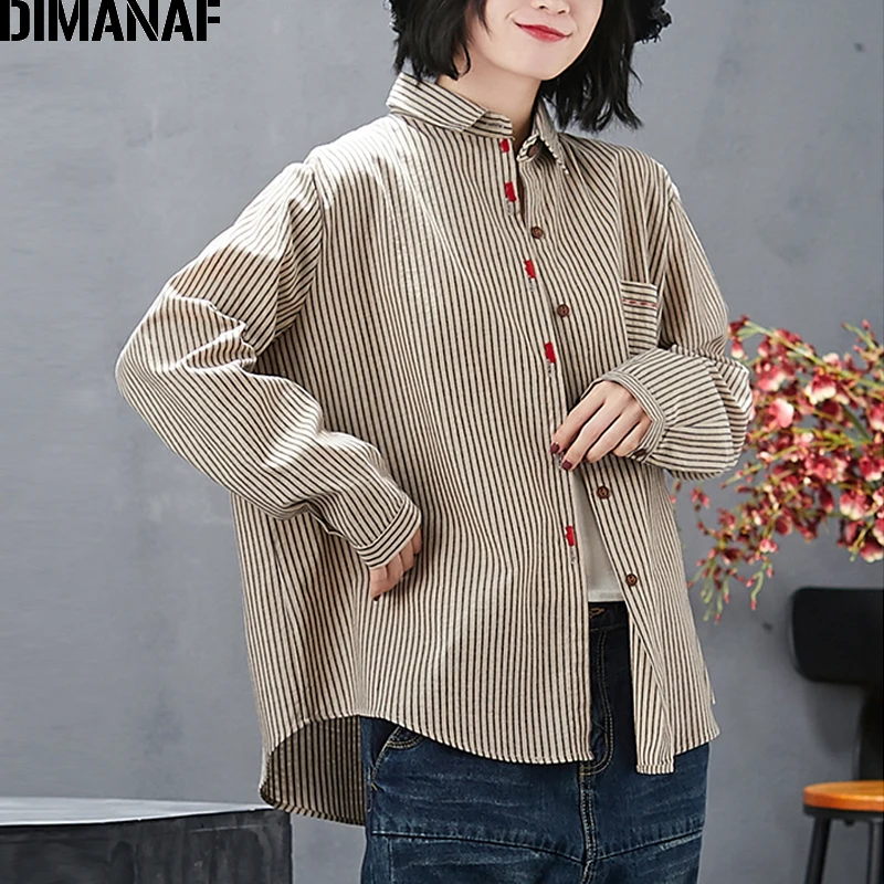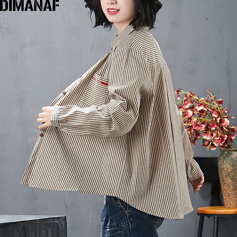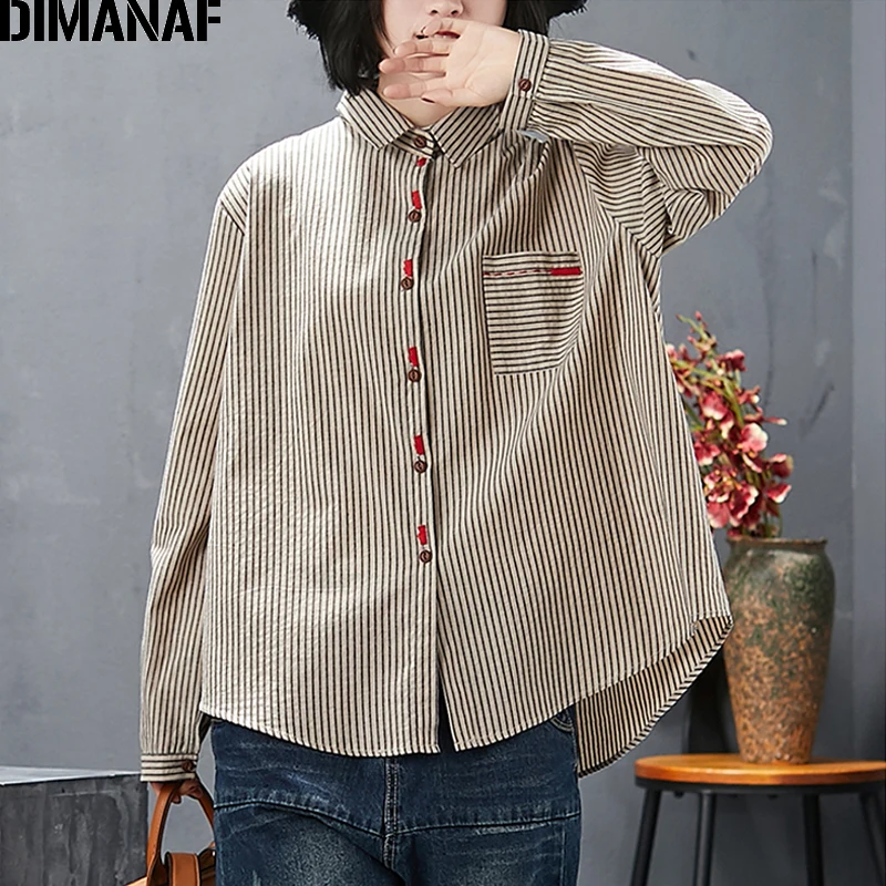 Женская офисная блузка DIMANAF, базовая хлопковая рубашка в полоску с принтом, повседневный Свободный кардиган, размера плюс, на весну