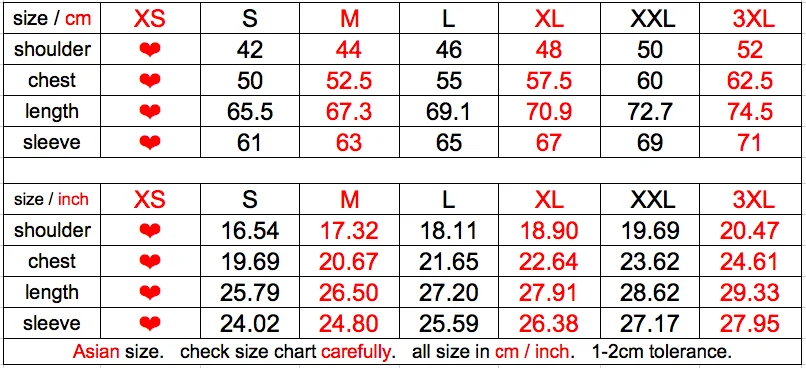 Пожалуйста, проверьте таблицу размеров и измерьте вашу куртку, как показано ниже.