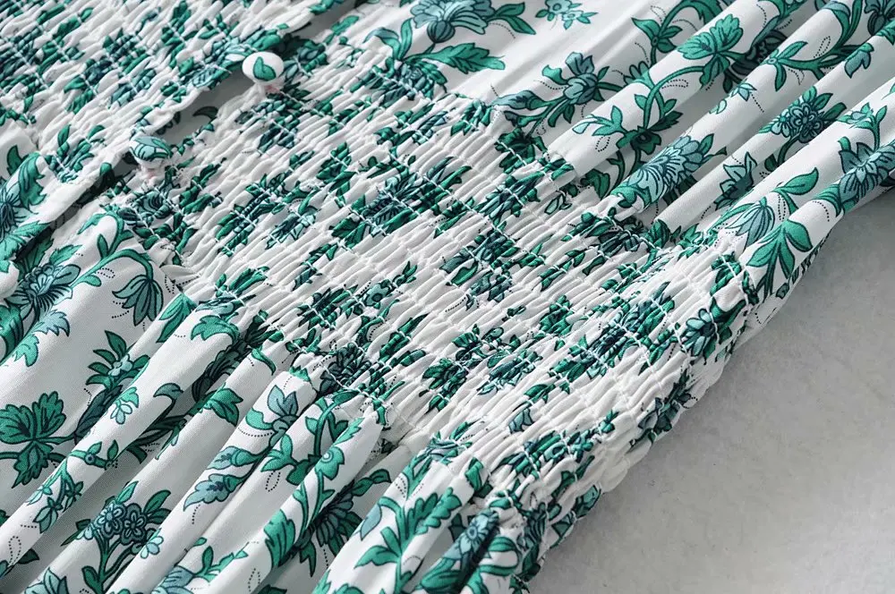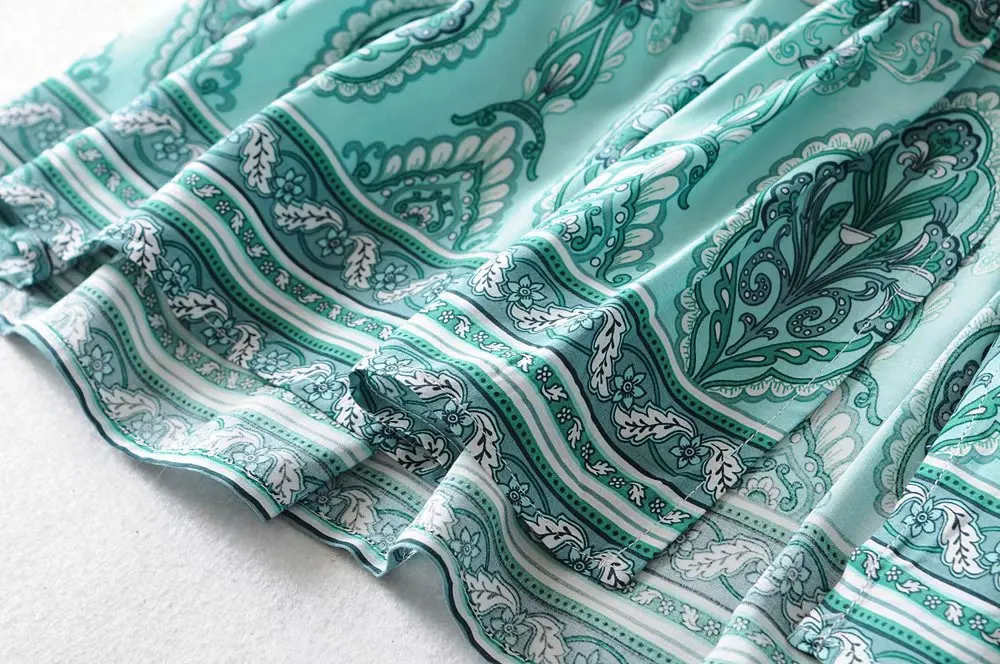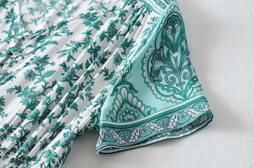 Винтажная шикарная женская зеленая богемная блузка с цветочным прин...