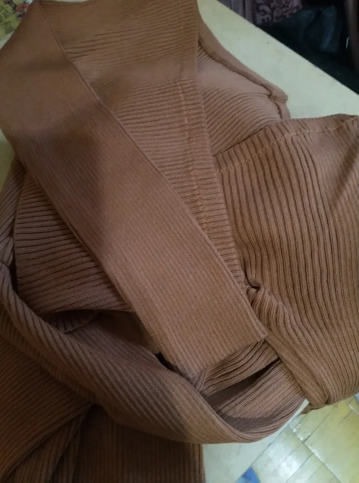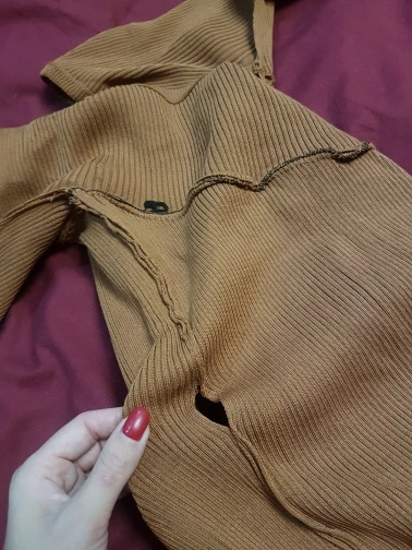 Это не хлопок, а синтетика, но хотя бы не низкокачественная, так, серединка. Может быть хлопок там и есть, но явно меньше 50%. Качество машинной вязки хорошее, швы нормальные, нитки не торчат. Сидит хорошо, отлично тянется, даже если наденет женщина вдвое меня шире. Платье довольно тонкое и явно не на осень как я хотела, особенно с таким составом. Ярлыков нет вообще никаких, ни производителя, ни состава ткани. Если бы не синтетика, то были бы 5 звёзд.