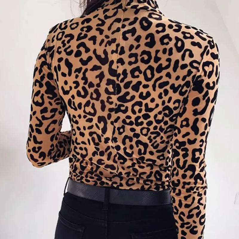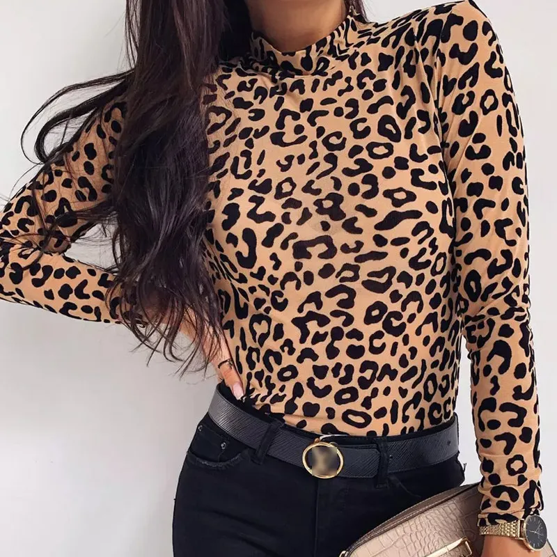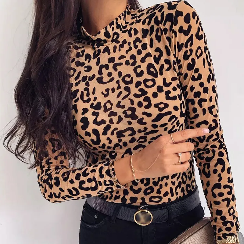 Прямая сделка, новинка, Женская облегающая футболка с длинным рукавом и леопардовым принтом, Женские повседневные топы