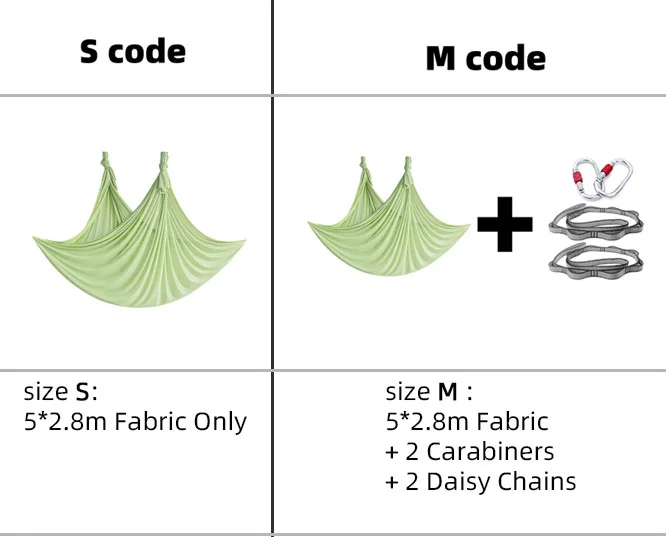 Размер S: только ткань 5*2,8 м Размер M: ткань 5*2,8 м + 2 карабина + 2 цепочки ромашки ● Аксессуары: Пожалуйста, выберите наборы, которые вы хотите, исходя из «размера S», «размера M». На рынке много воздушных гамаков для йоги, но наш базовый гамак для аэройоги сделан из сертифицированного качественного материала и фурнитуры. 1x5,5 ярдов эластичный Воздушный Гамак, 2 x стальные карабины с винтовым замком (25 кН), 2x3 фута нейлоновые армированные ромашки (23 кН). Максимальная номинальная нагрузка для динамической нагрузки 2000 фунта. Цепи ромашки и карабины сертифицированы по стандартам скалолазания. 40-денье нейлоновый трикотажный-Двусторонняя Растяжка. Когда он скреплен как качели, а когда вы кокон внутри гамака ткань дает как раз достаточно, чтобы она чувствовала себя комфортно для тела и кожи. Его можно полностью убрать в коконы или полностью укладывать. Это эластичная ткань. Не похож на Материал парашютного типа, часто используемый на других качелях в стиле йоги. Эта ткань премиум класса используется для строп для йоги и воздушных шелков. Он долговечен и удобен. Двойная точка отлично подходит для расслабления, растяжения, снижения стресса и боли в спине. Этот двухточечный гамак для йоги легко попасть внутрь и наружу, легко чистить, очень удобно и легко регулировать высоту. Закажите сейчас, это лучший гамак для йоги на рынке!