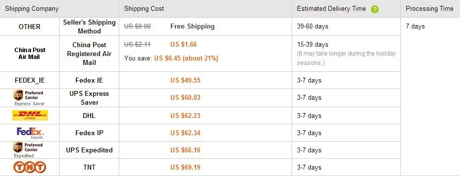 Мы отправим вам поПочта Китая обычный маленький пакет плюс, если ваш заказ меньше 5$. Отправляется по Aliexpress, поэтому посылка не будет потеряна. Мы не примем спор, если вы откроете спор по логистике без посылка ЛКИ. Поэтому я надеюсь, что вы можете подождать около 60-90 дней с терпением, вы должны получить посылка. Фактически вы получаете посылка через 30-60 дней. Если вы хотите упаковать посылка, вы можете заплатить дополнительные деньги за пересылку:Http://www.aliexpress.com/store/product/China-Post-Registered-Air-Mail-For-Who-Wants-to-Have-a-Fast-Shipment/1728958_32611908360.html
