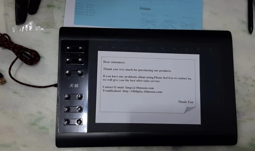 Tablette reçue dans les délais. Très bien emballée. C'est ma première tablette et je suis assez satisfait du produit (installation directe et sans peine, prise en main rapide). Il faut s'y habituer un peu comme la première utilisation de la souris :) . Pour ma part, je vais l'utiliser pour la correction de copies avec PDF Viewer et à première vue ça fonctionne assez bien, même sans le gant. Je n'ai pas encore programmé les boutons de raccourci et de ce côté les explications sont sommaires, il va falloir chercher ...