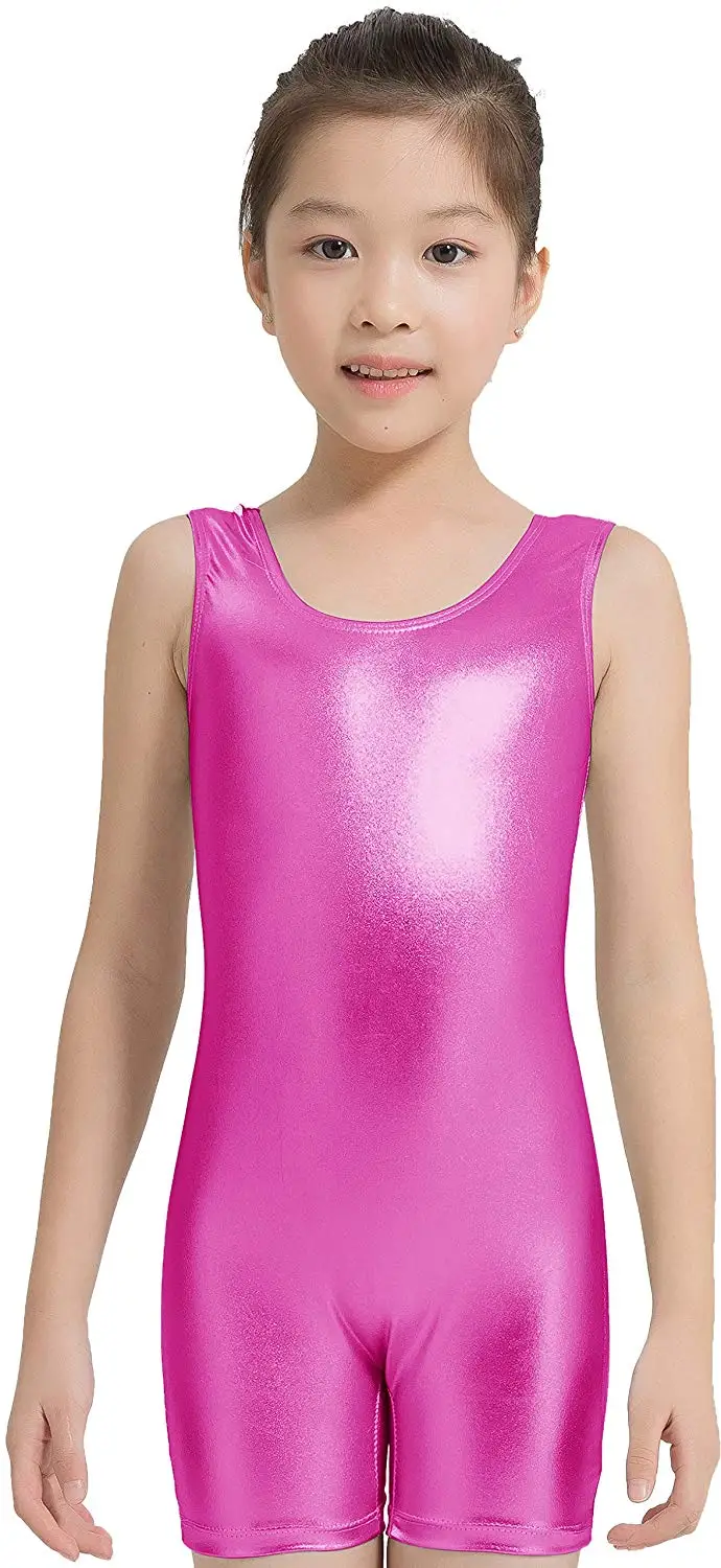 Базовый комбинезон без рукавов выполнен из блестящего металла, который обязательно будет сиять во время любого соревнования или выступления. Цвета фуксии, красный, фиолетовый, золотой, серебряный, небесно-голубой, синий очень популярны для детей и малышей.