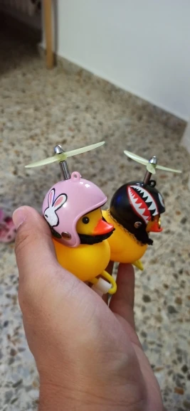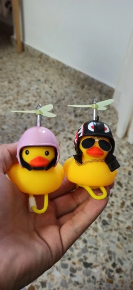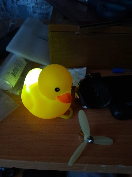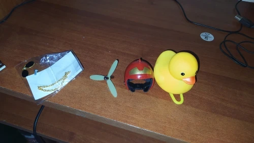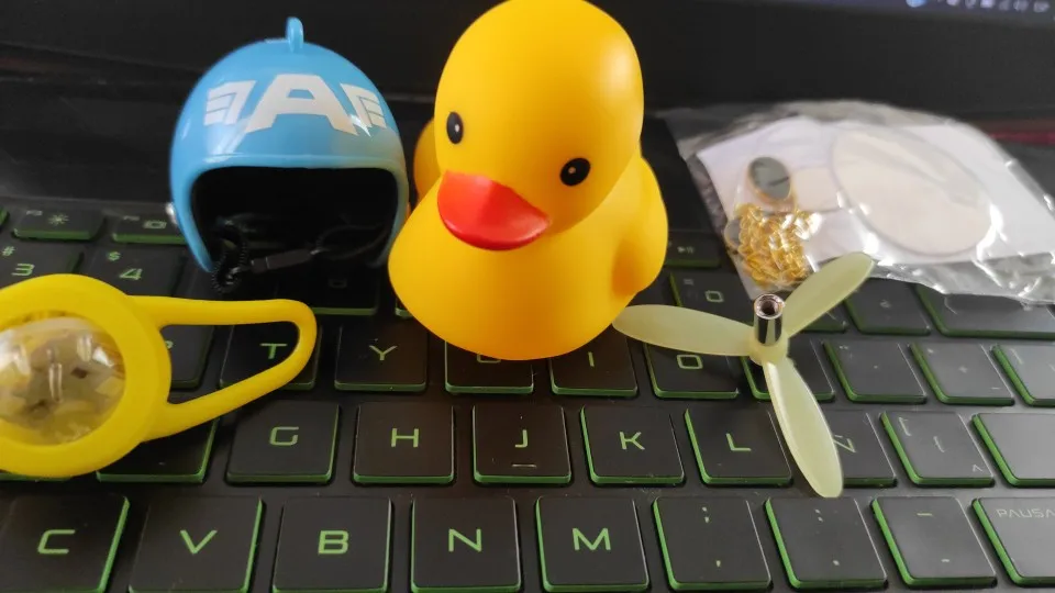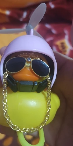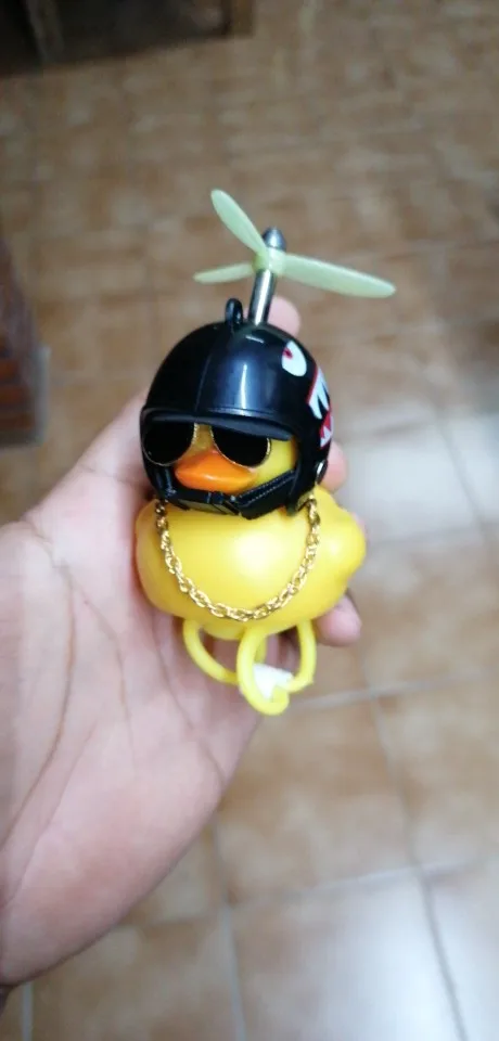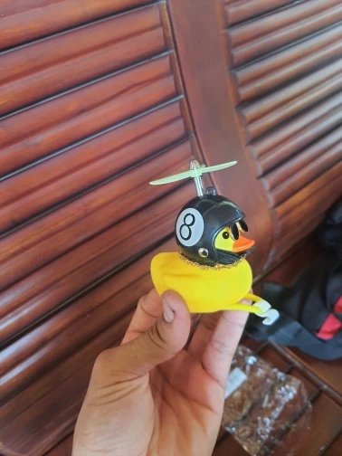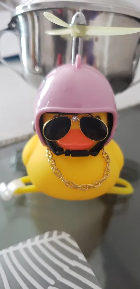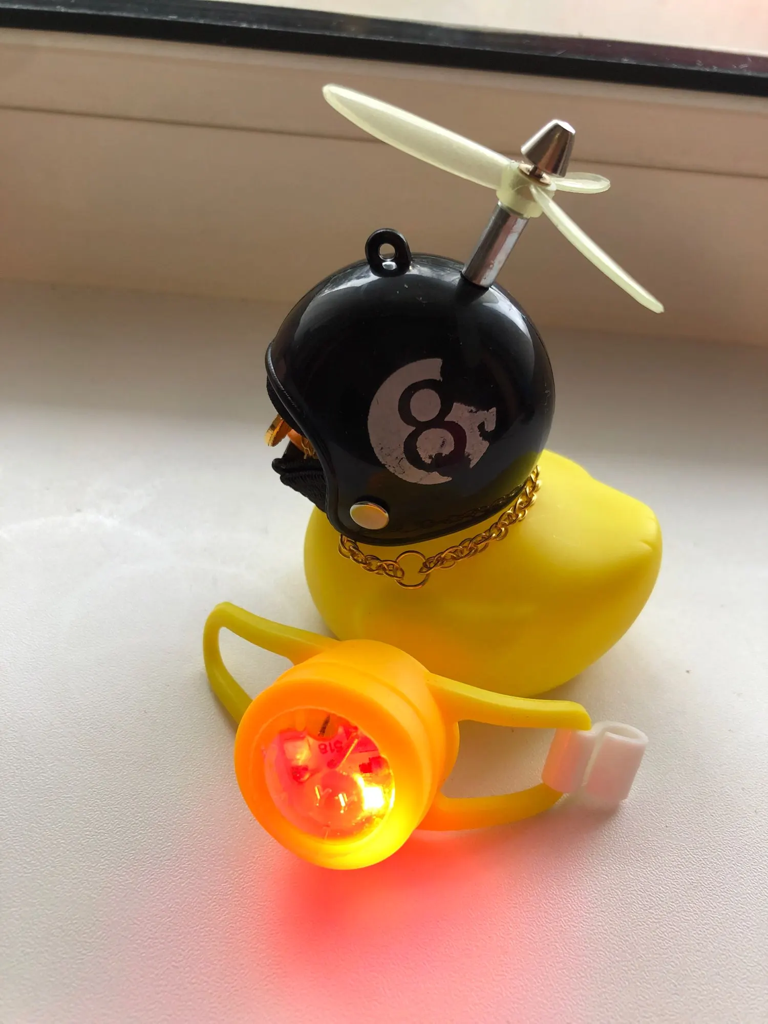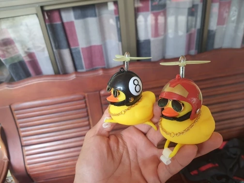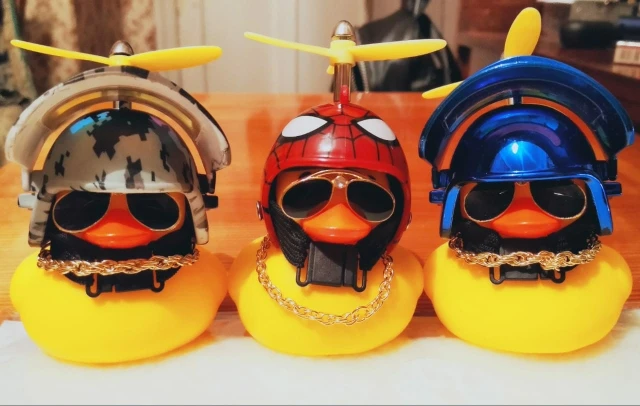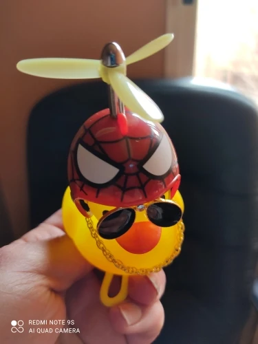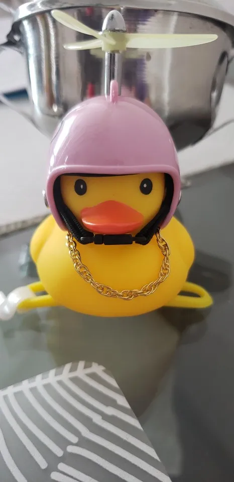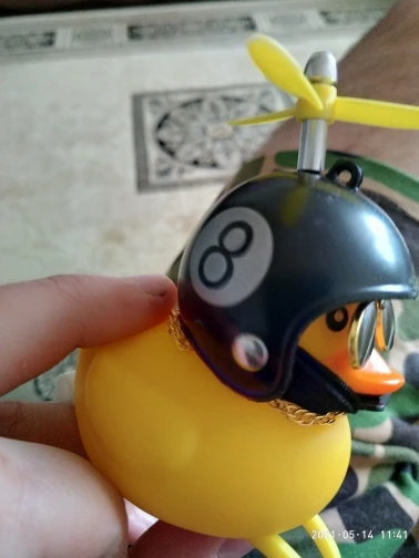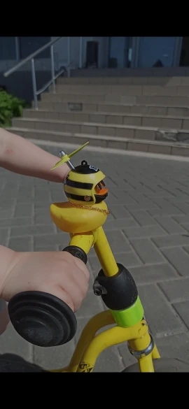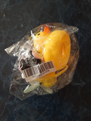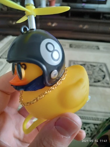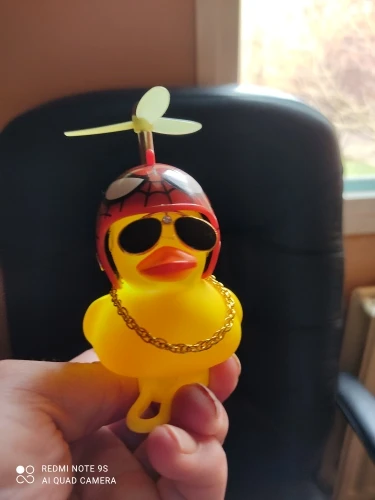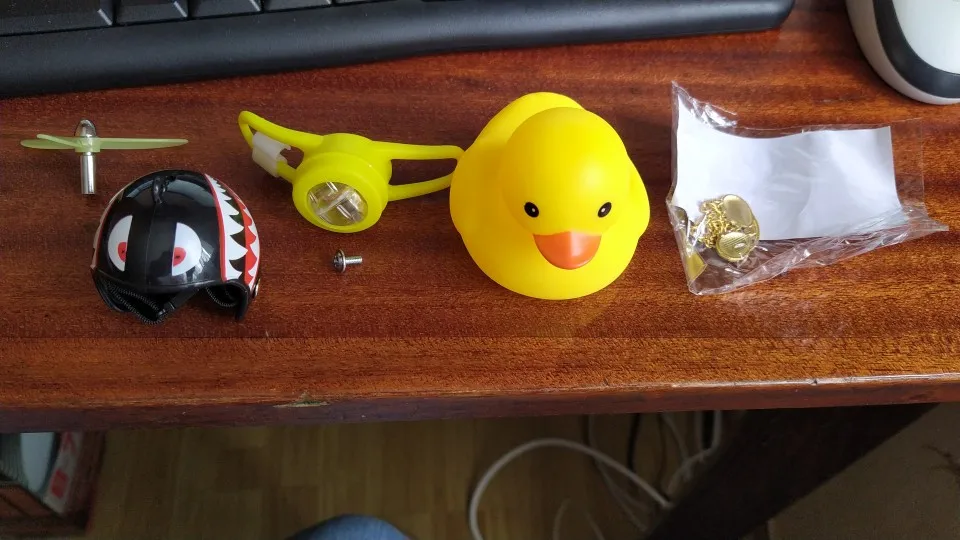 Шла долго, но пришла. Не стал приклеивать очки - как-то они хлипенько держатся на утенке, но сами по себе норм. Сразу прицепил на велик - в дороге пропеллер не крутится - хз по чему. В комплекте цепочка, два наклейки, шлем, и крепление на руль с подсветкой. Что делать с наклейкой не понял - пока отложил, держится все и так По качеству исполнения тоже норм - обычная резиновая уточка с пищалкой