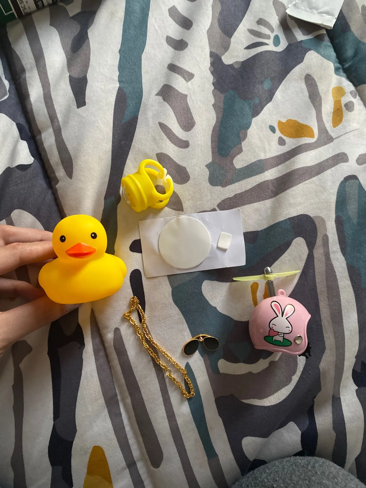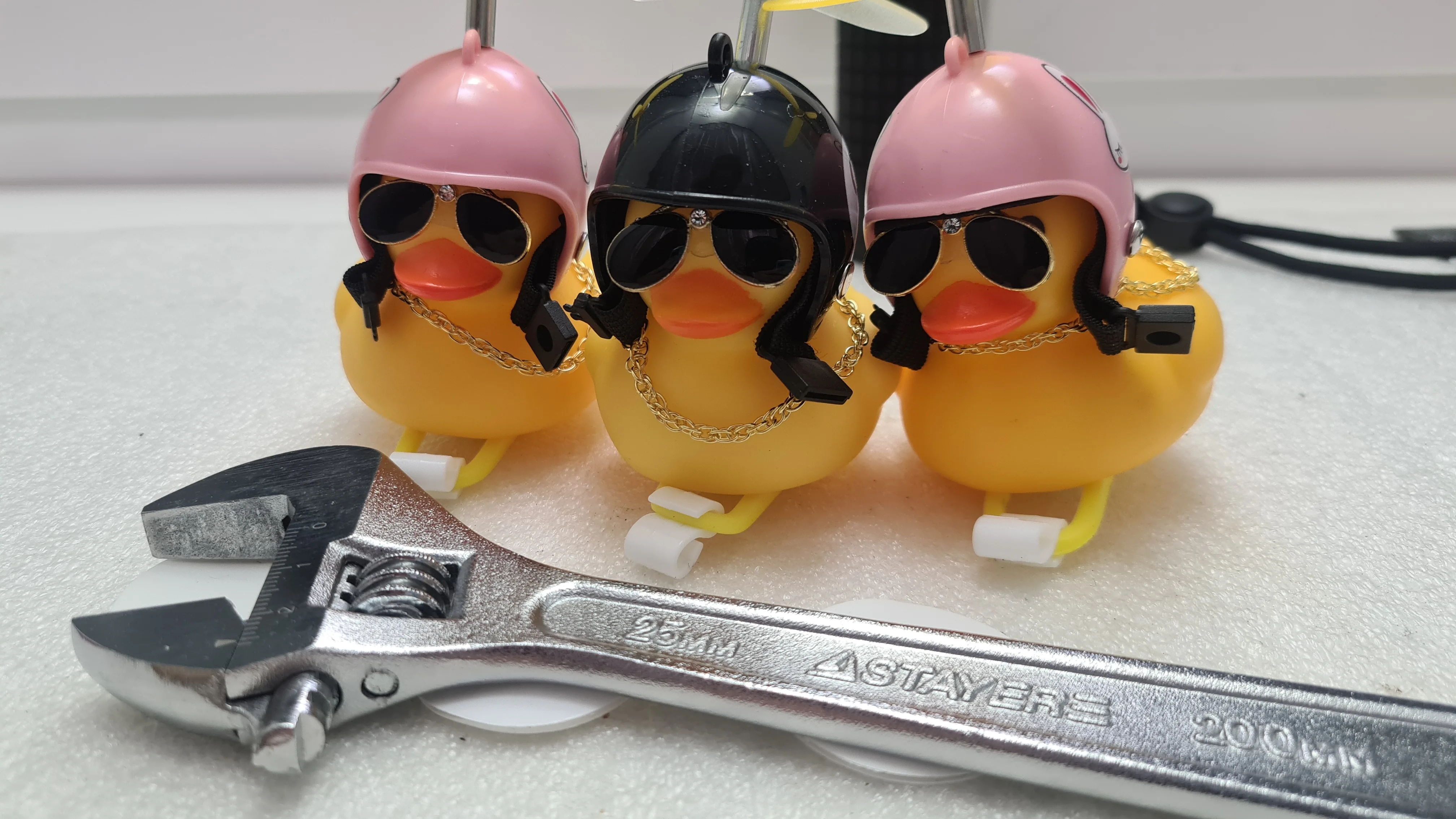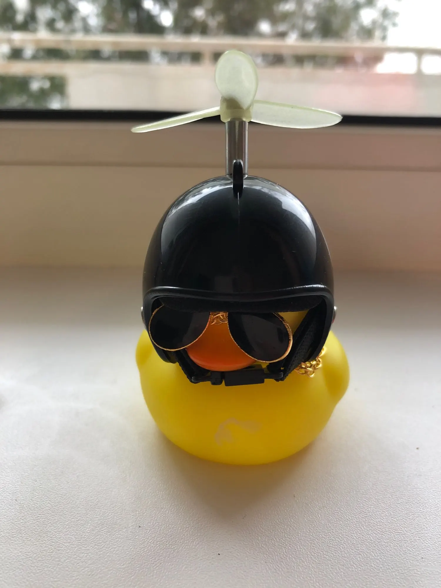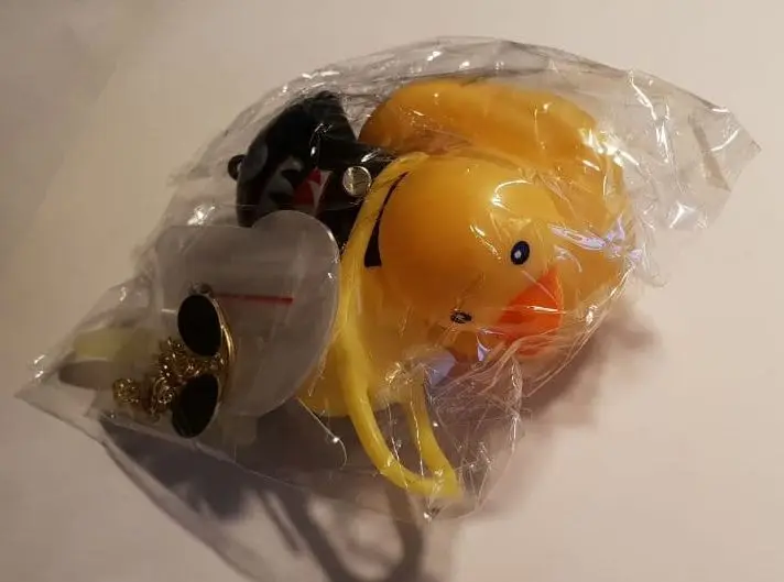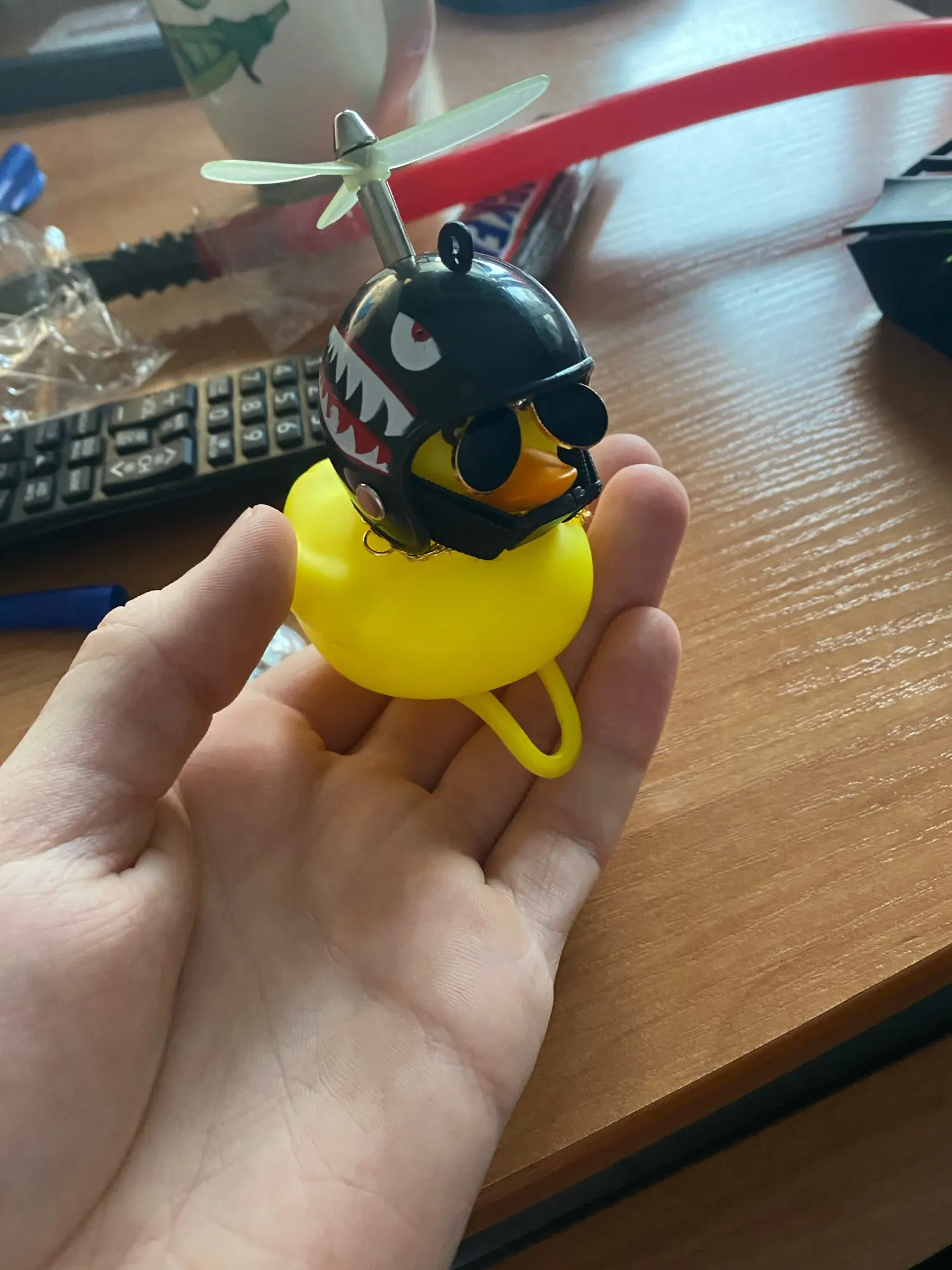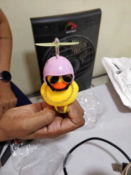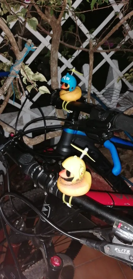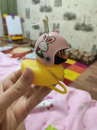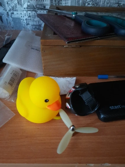 Шла долго, но пришла. Не стал приклеивать очки - как-то они хлипенько держатся на утенке, но сами по себе норм. Сразу прицепил на велик - в дороге пропеллер не крутится - хз по чему. В комплекте цепочка, два наклейки, шлем, и крепление на руль с подсветкой. Что делать с наклейкой не понял - пока отложил, держится все и так По качеству исполнения тоже норм - обычная резиновая уточка с пищалкой