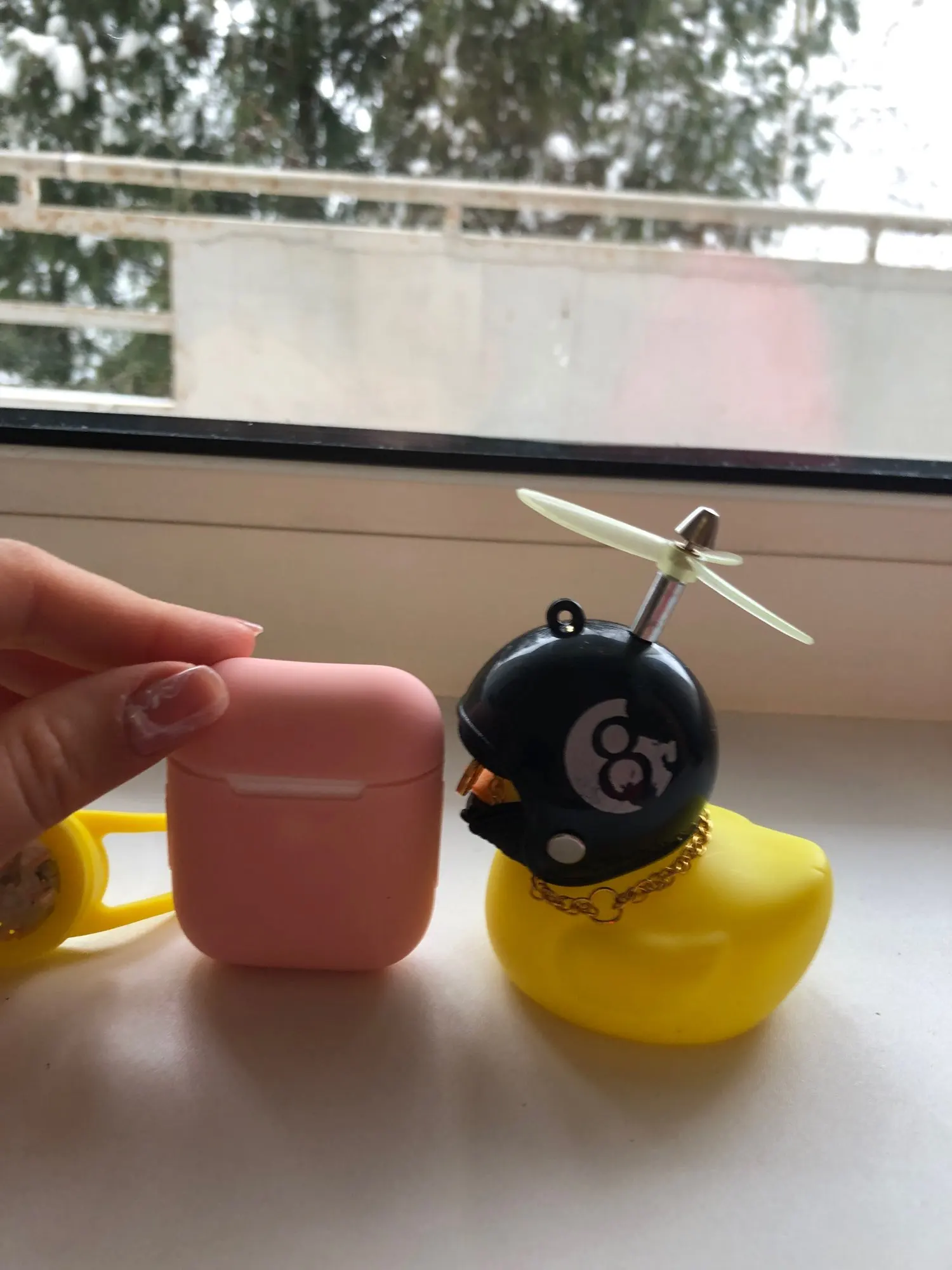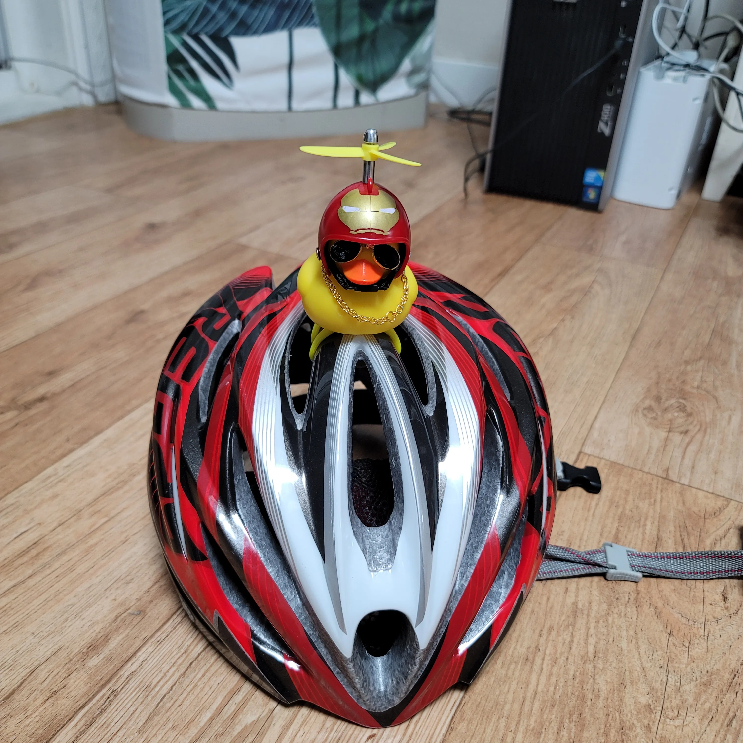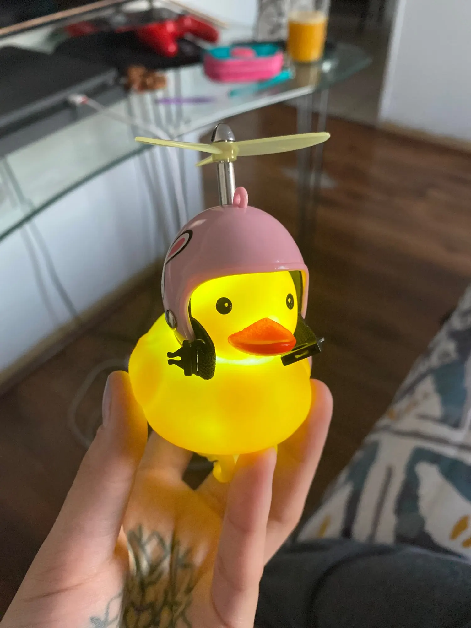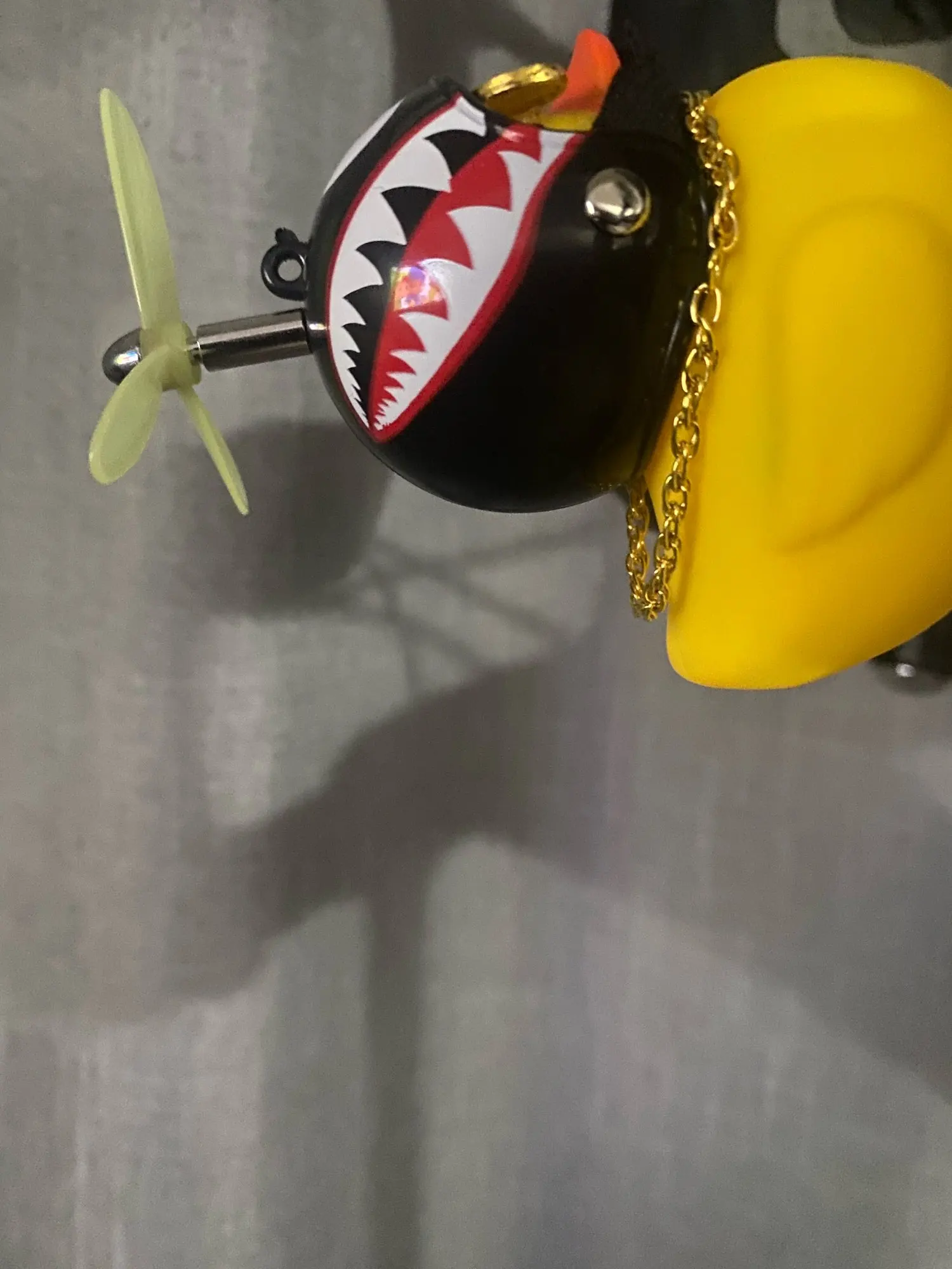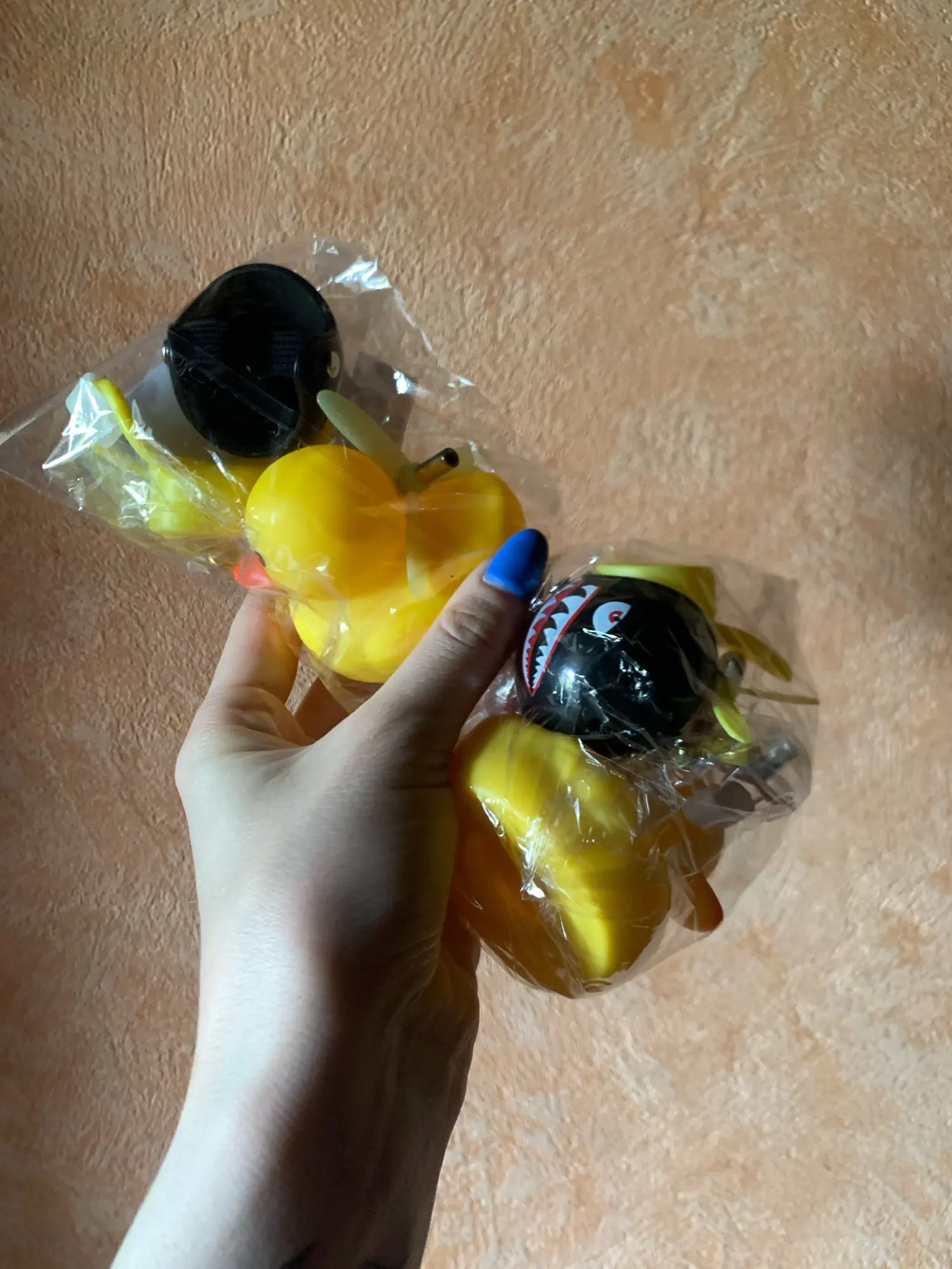 Шла долго, но пришла. Не стал приклеивать очки - как-то они хлипенько держатся на утенке, но сами по себе норм. Сразу прицепил на велик - в дороге пропеллер не крутится - хз по чему. В комплекте цепочка, два наклейки, шлем, и крепление на руль с подсветкой. Что делать с наклейкой не понял - пока отложил, держится все и так По качеству исполнения тоже норм - обычная резиновая уточка с пищалкой