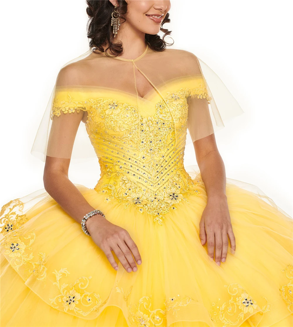 Желтое Тюлевое Пышное Платье с открытыми плечами, многослойное бальное платье с кристаллами и цветами, бальное платье