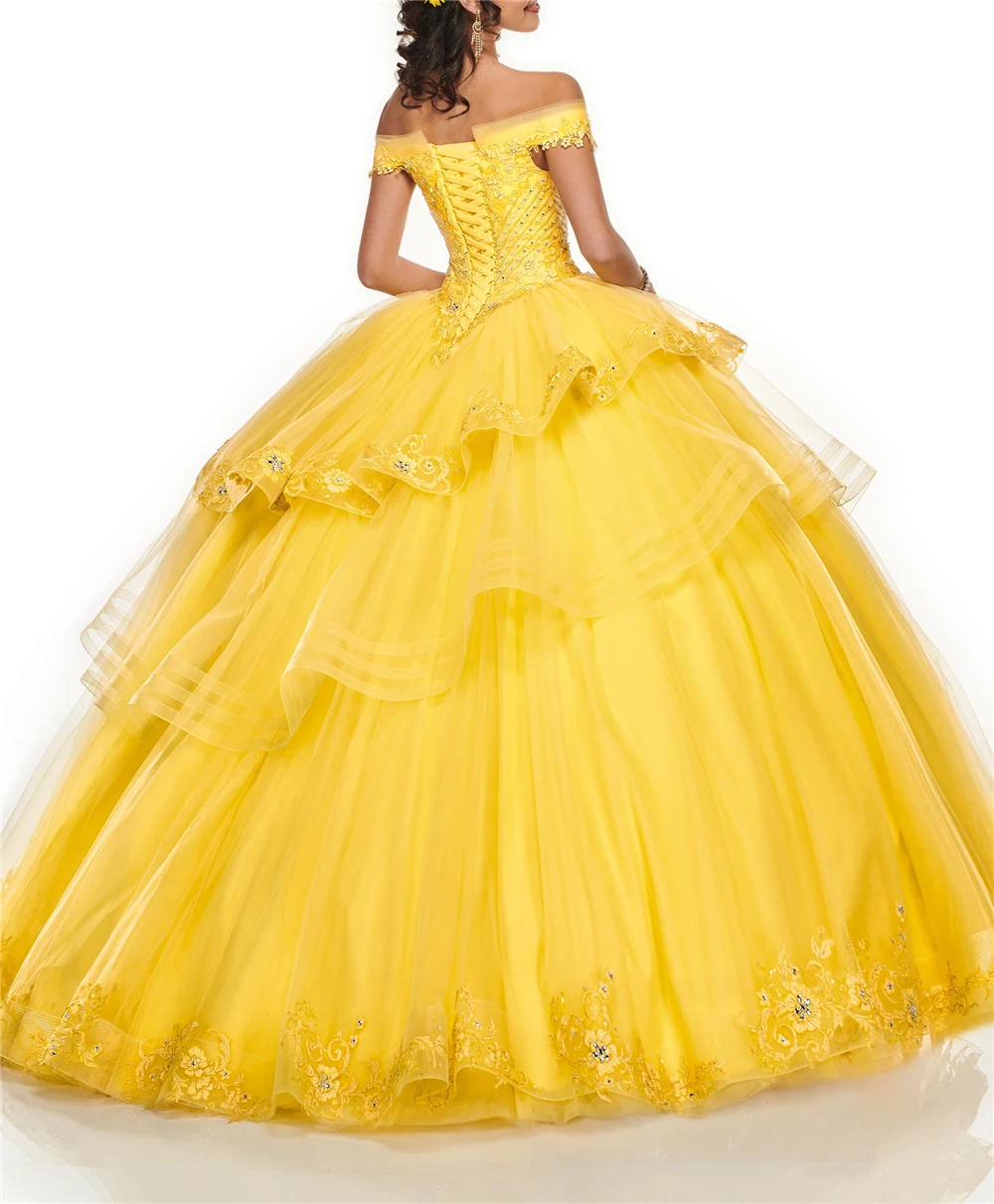 Жёлтое Тюлевое платье с открытыми плечами, многослойное бальное платье с цветочным бисером и кристаллами, бальное платье