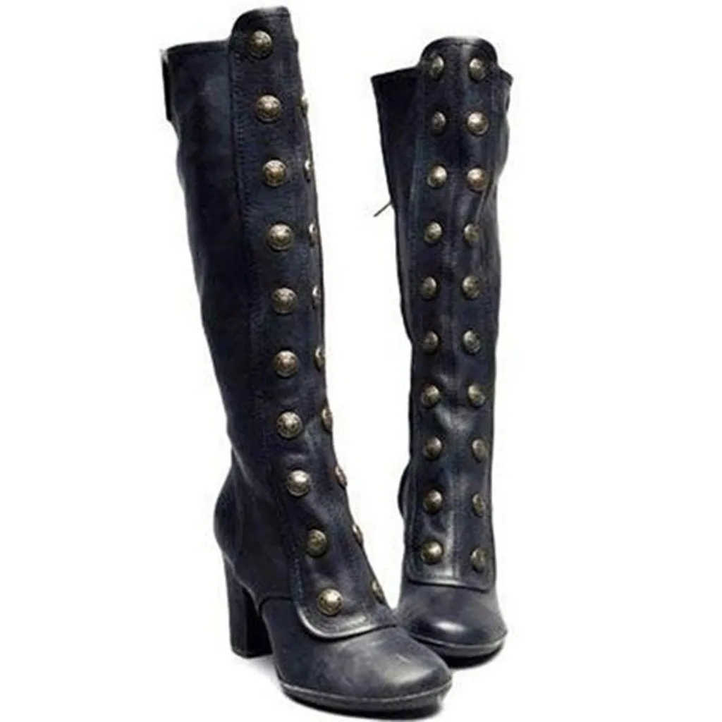 Женские высокие сапоги до колена, модные ретро сапоги с заклепками и боковой молнией, обувь на высоком каблуке в стиле ретро, женские высокие сапоги, теплые сапоги для пешего туризма и снега