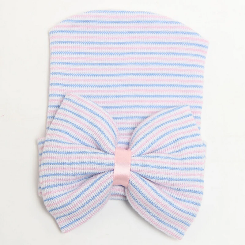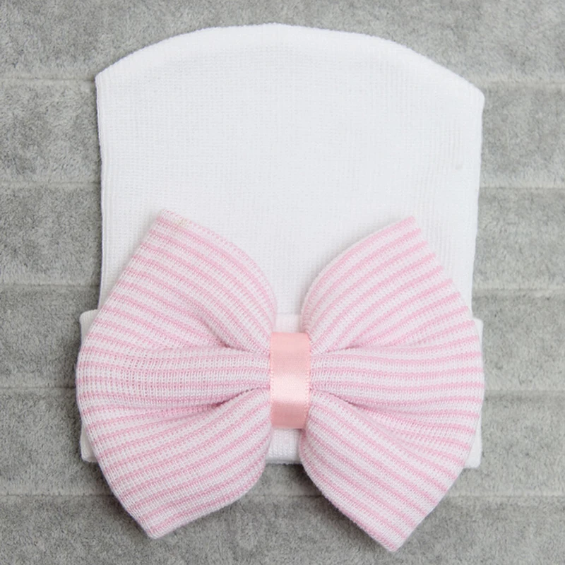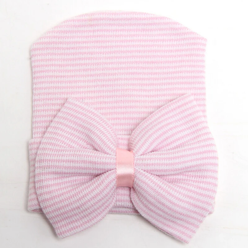 Шапка-бини для новорожденных девочек и мальчиков, теплая Милая полосатая мягкая шапка с бантом, осень-весна