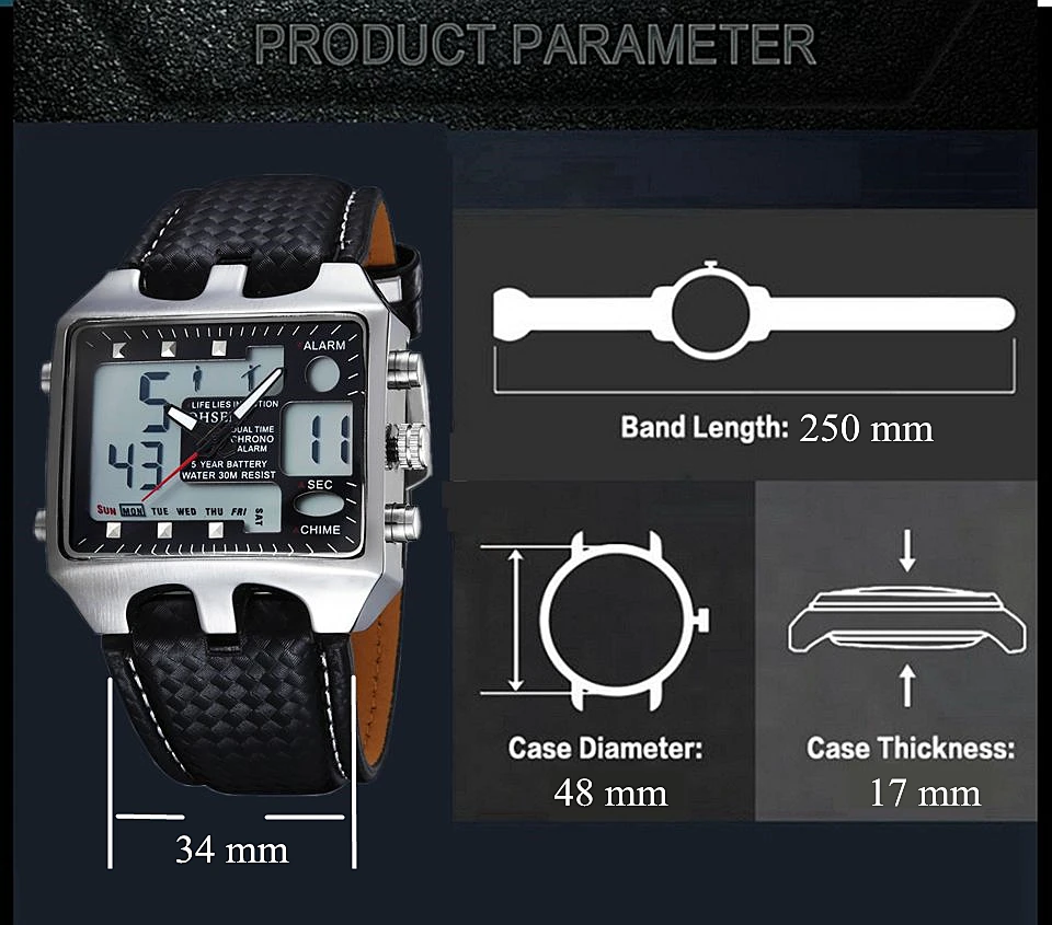 Отображение двух часовых поясовЦифровой: часы, минуты, секунды, pm, месяц, дата, день12/24 формата отображения времениЦифровой светодиодный дисплей, нажмите кнопку "Light", чтобы четко видеть время в темнотеФункция будильника и ежечасного звонкаСпециальный дизайн с хронографом (секундомером) с шагом 0,01 секундВодонепроницаемость до 50 м (не нажимайте кнопки в воде)Ударопрочность, подходит как для занятий спортом на открытом воздухе, так и для занятий спортом в помещении