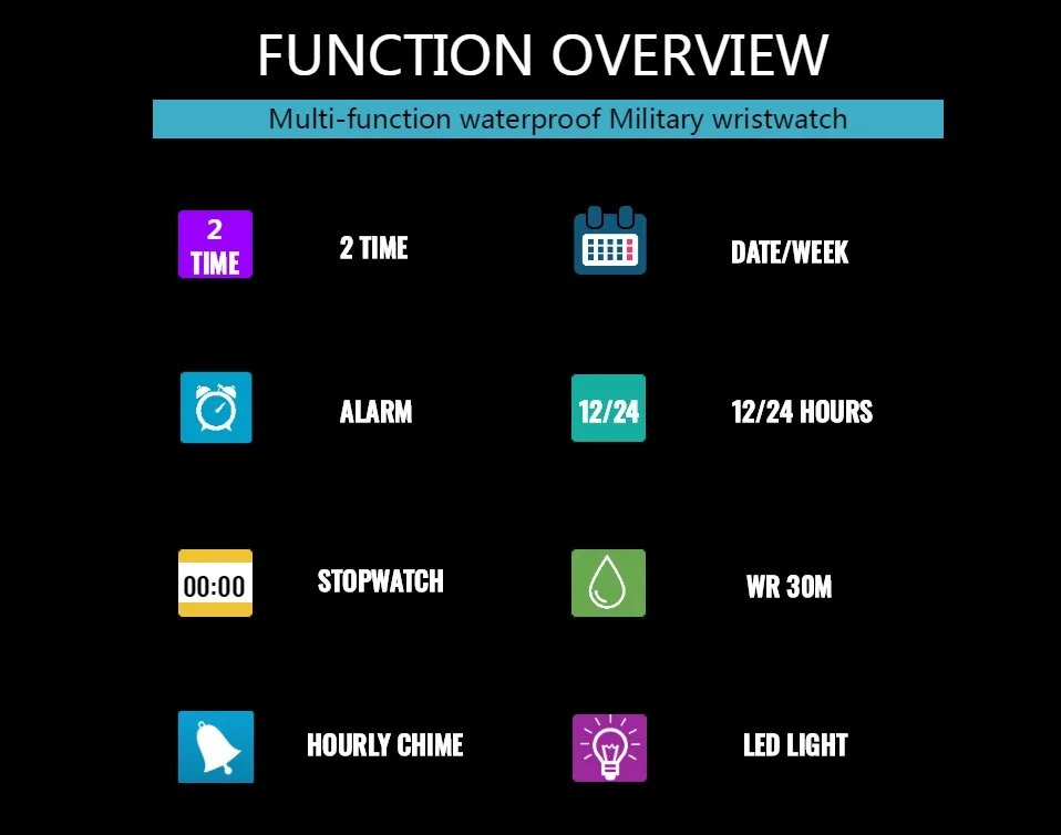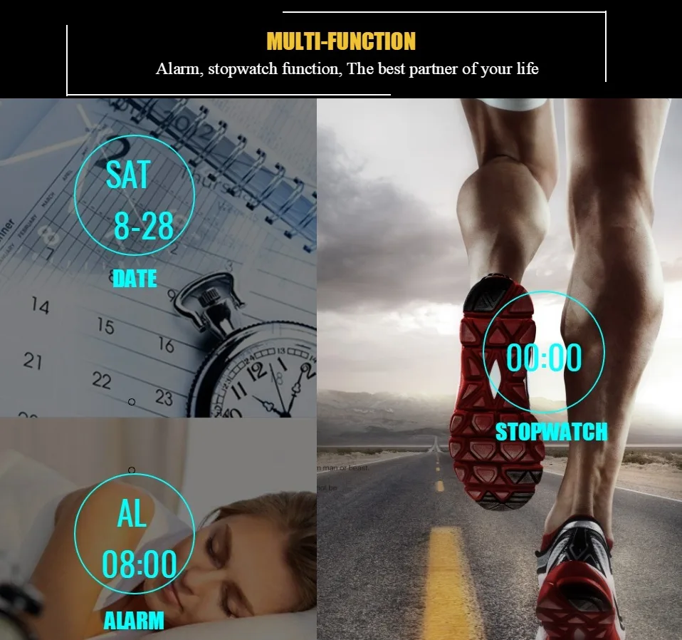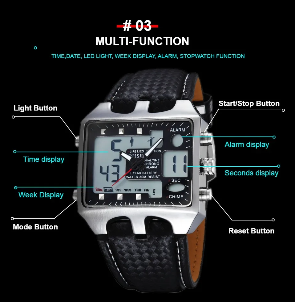 Отображение двух часовых поясовЦифровой: часы, минуты, секунды, pm, месяц, дата, день12/24 формата отображения времениЦифровой светодиодный дисплей, нажмите кнопку "Light", чтобы четко видеть время в темнотеФункция будильника и ежечасного звонкаСпециальный дизайн с хронографом (секундомером) с шагом 0,01 секундВодонепроницаемость до 50 м (не нажимайте кнопки в воде)Ударопрочность, подходит как для занятий спортом на открытом воздухе, так и для занятий спортом в помещении