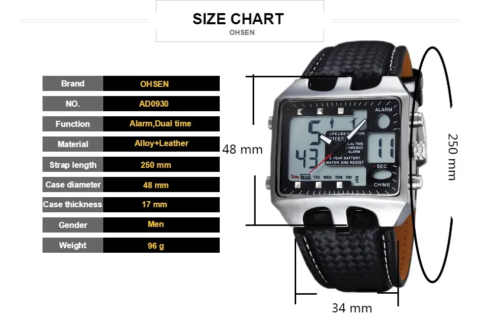 Прочный водонепроницаемый чехол для часов из сплаваЯпония Maxell кнопочная ячейка, длительный срок службыКожаный ремешок хорошего качества, более удобныйЗадняя крышка из нержавеющей стали с лазерным логотипом OHSEN