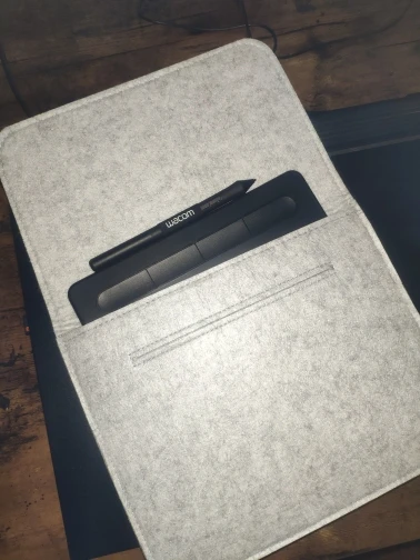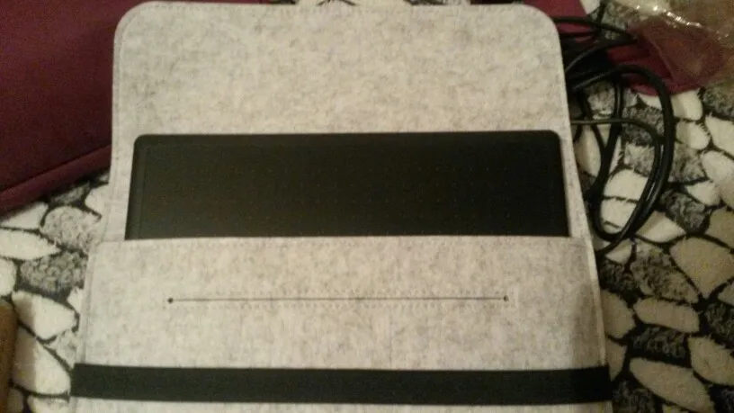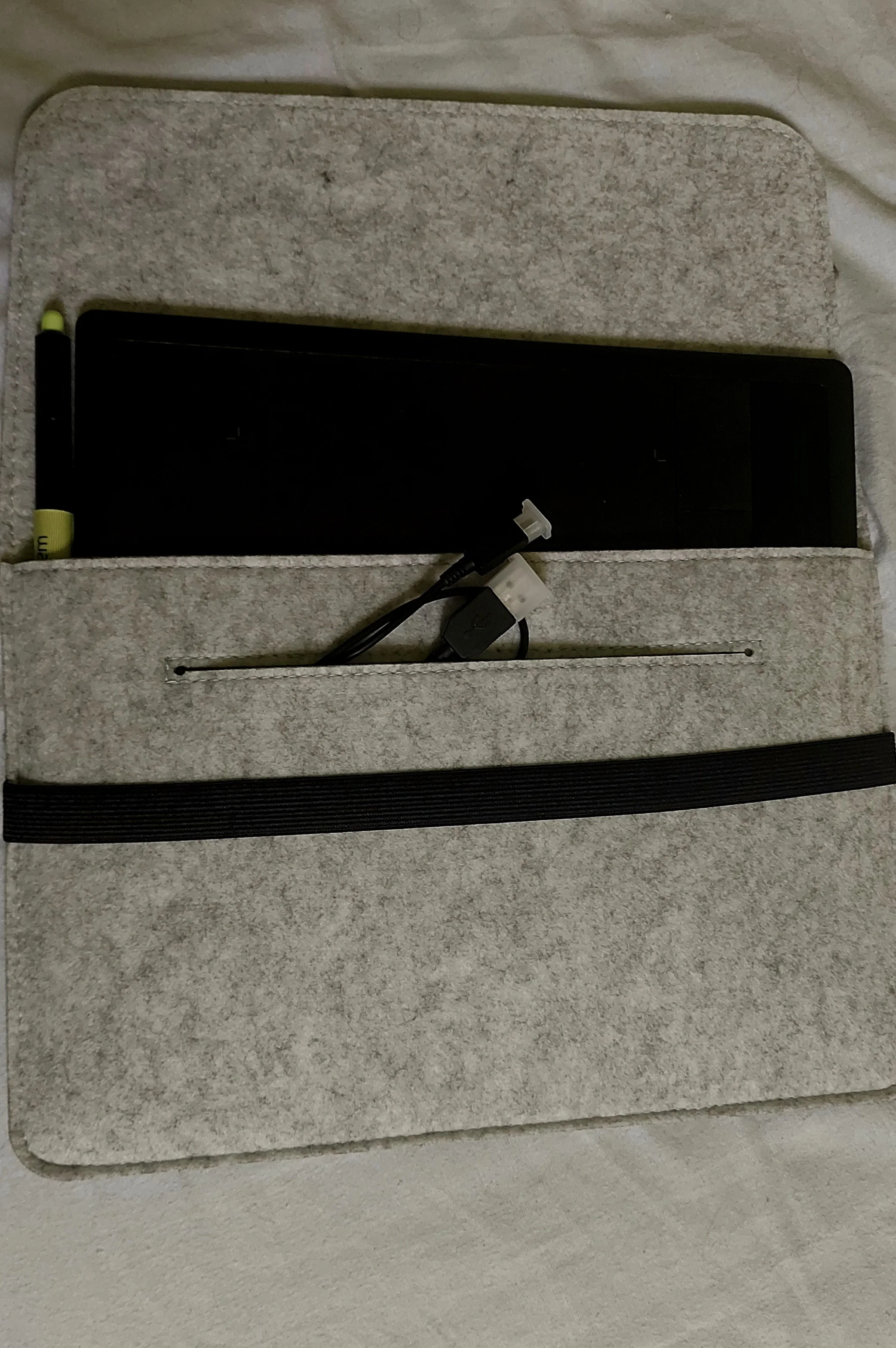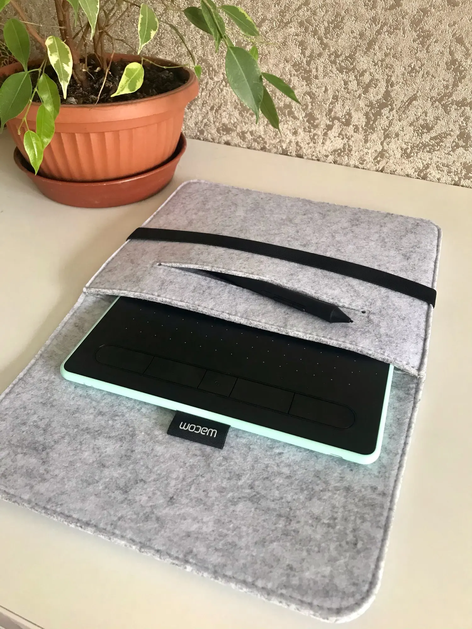 планшет помещается внутрь вместе с пером. на ощупь как валенок. есть дополнительный кармашек, поместятся запасные кончики.