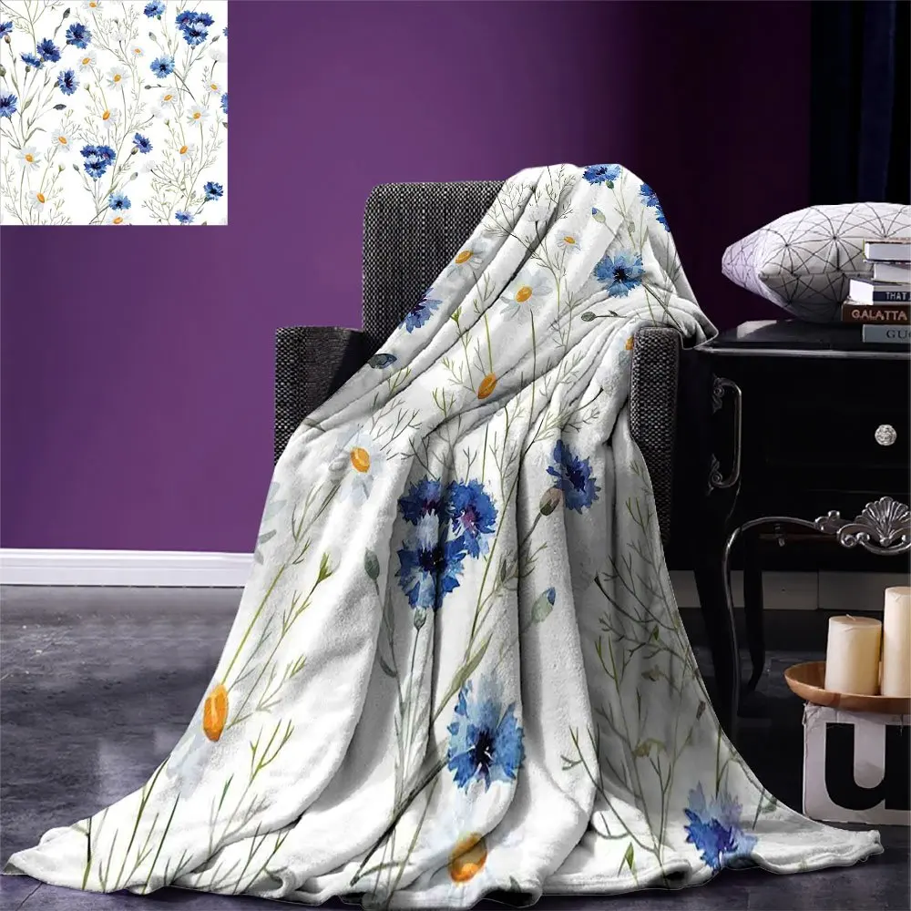 Одеяло с акварельными цветами, дикие и васильковые ромашки, теплый плед для кровати, синего шалфея