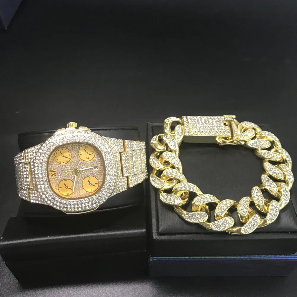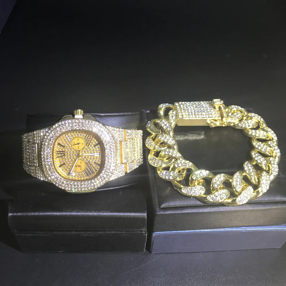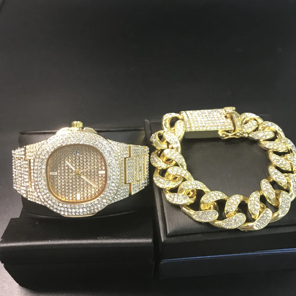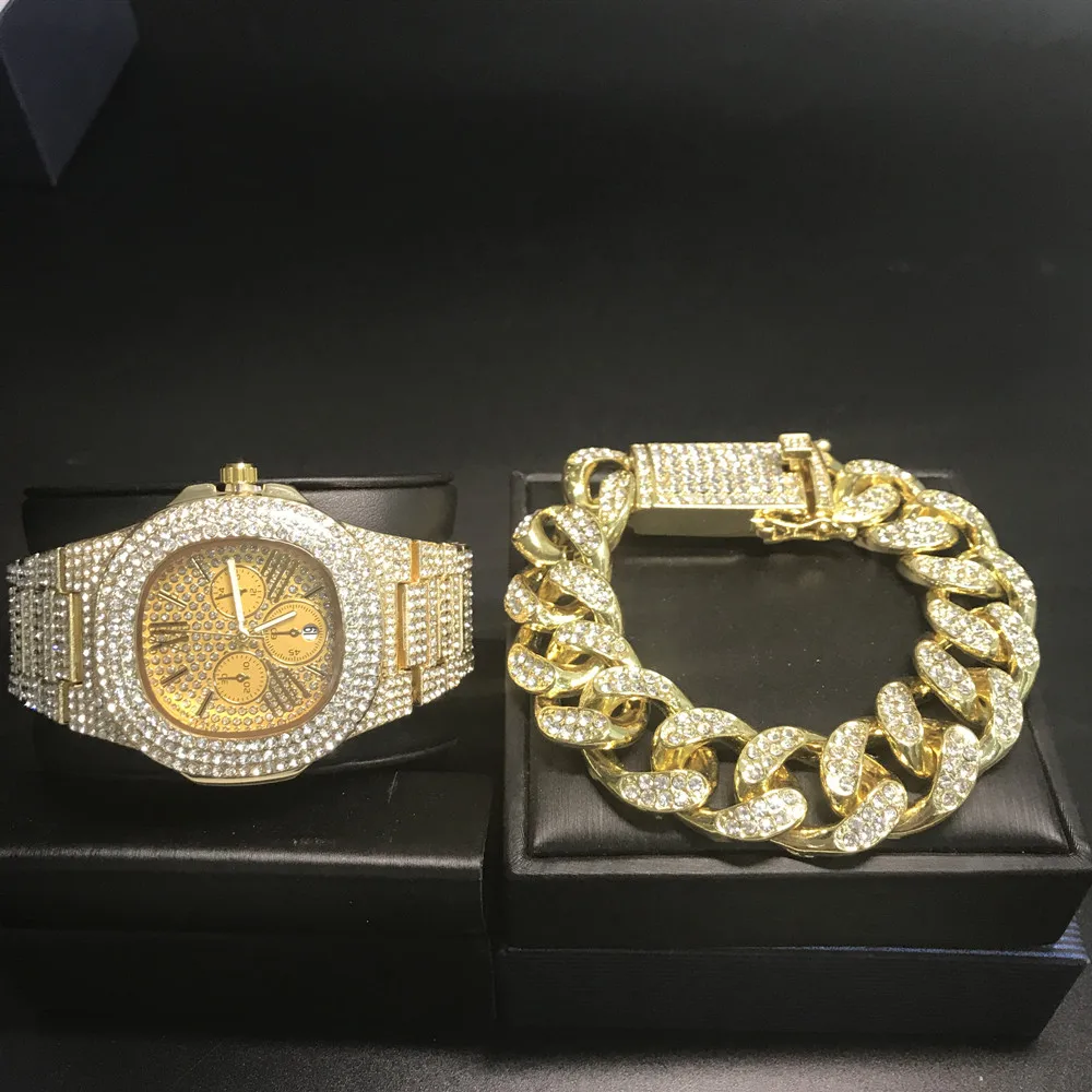 Роскошные мужские часы и браслет золотого цвета, комплект мужских часов из кубинской цепи с кристаллами Майами в стиле хип-хоп