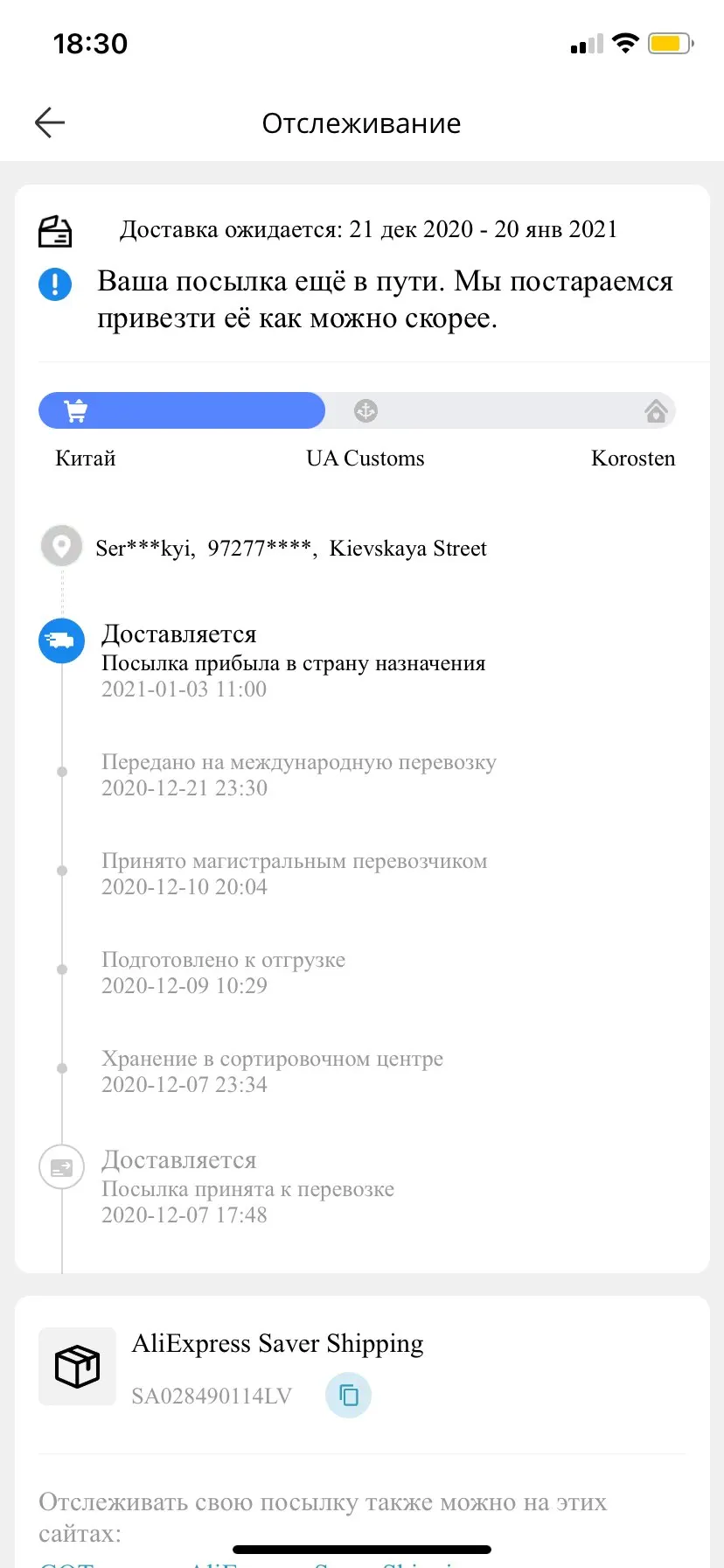 Заказывал 12.11.2020 , в установленный срок заказ не пришёл , продавец увеличил время доставки , заказ всё равно не пришёл , открыл спор , Али написали : т.к. вы выбрали доставку службой Али ( Я хз , в душе не е...у ) подождите ещё не много , мы проверили заказ в пути , спор был открыт очень долго как ни когда недели три , в итоге Али пишут что вы правы заказ INVALID , и вернули деньги ! И о чудо с почты пишут : ваш заказ пришёл , иду получаю , всё пришло в целости и сохранности 20.02.2021 !!!! И того время в пути составило 3 месяца и 1 неделя !!! КОШМАР !!!