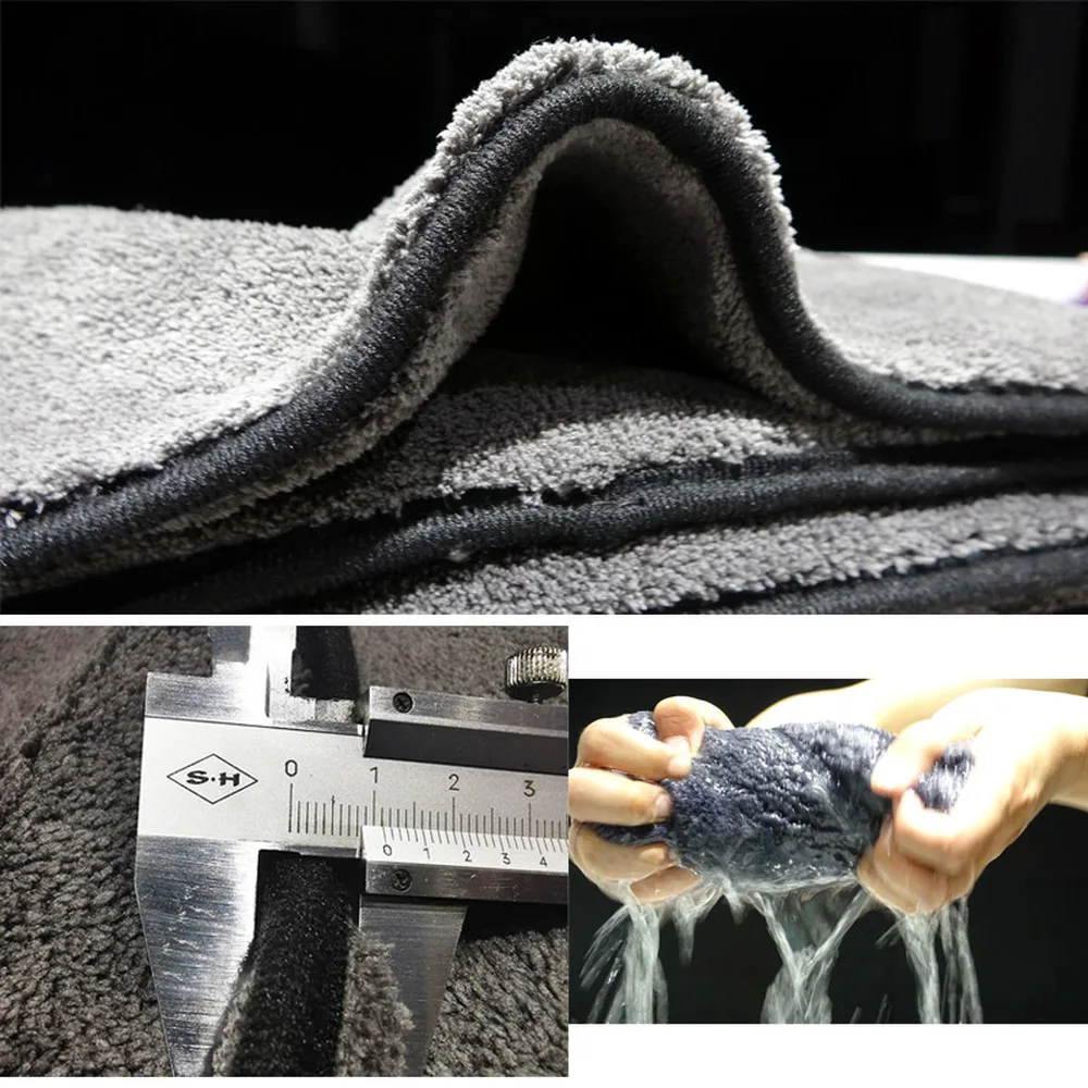 1. 1200gms. Лучшее Полирующее полотенце! Невероятный захват для более легкого удаления воска, полировальное полотенце Super Plush разработано специально для удаления воска и герметика. 2. Лучше всего подходит для сушки влажных поверхностей или для использования с быстрой детализацией и без воды изделий для автомойки 3. Двухсторонний и 2-х слойный плюш. Может поглощать почти в 10 раз больше веса в жидкости. Не только быстро всасывает воду, но и быстро и легко отжимается, черные Прошитые края не царапают поверхности. 4. Экономьте время, деньги и Защитите свою краску, не придется ходить на мойку автомобиля. Материал премиального качества и усиленные края делают это полотенце прочным и долговечным. 5. Ультра мягкие, плюшевые, с длинным ворсом неабразивные салфетки из микрофибры не царапают краски, пальто или другие поверхности, используется для хрусталь, зеркала, плитку, окна, автомобили, руки, посуду и т. д.