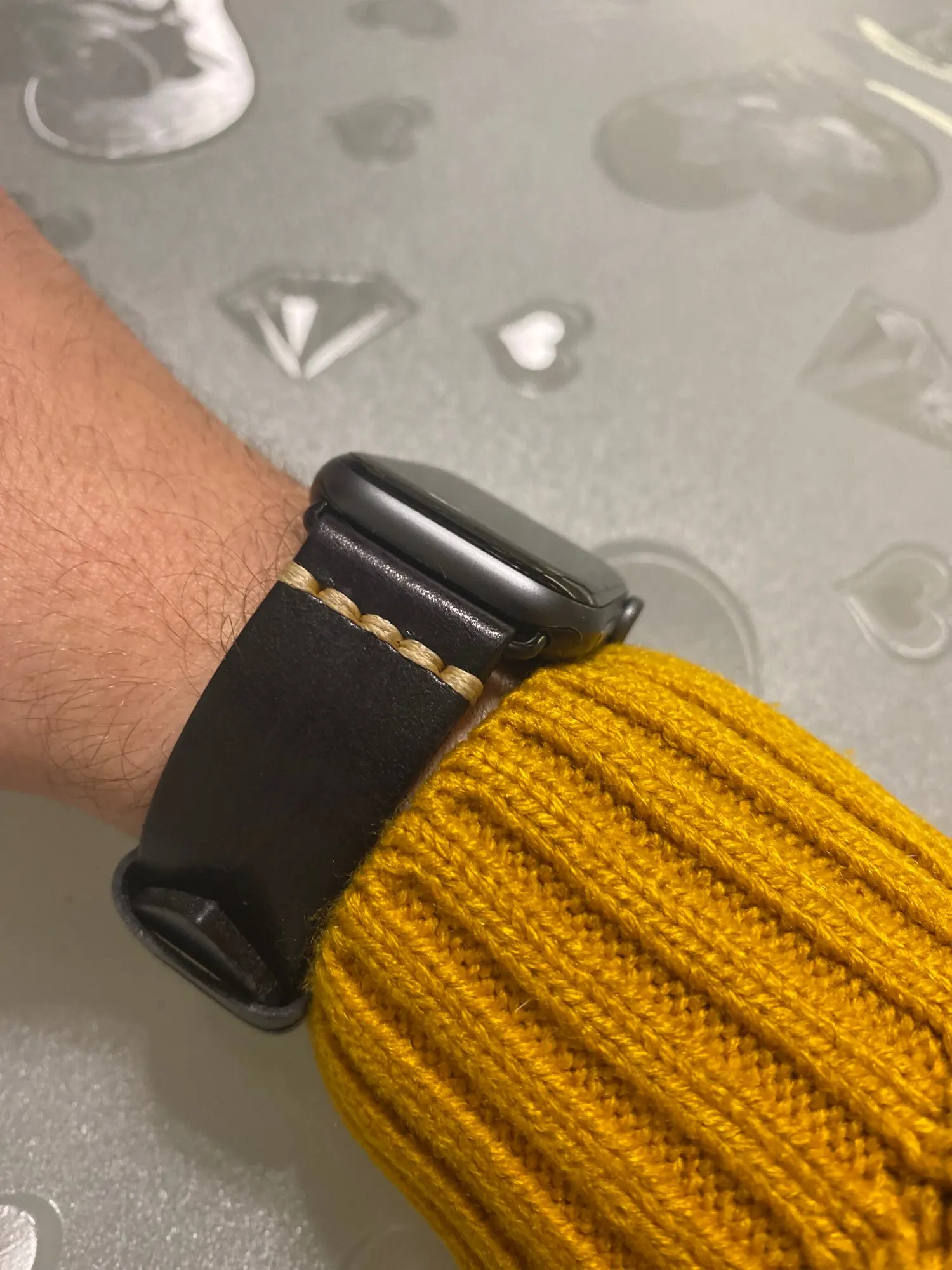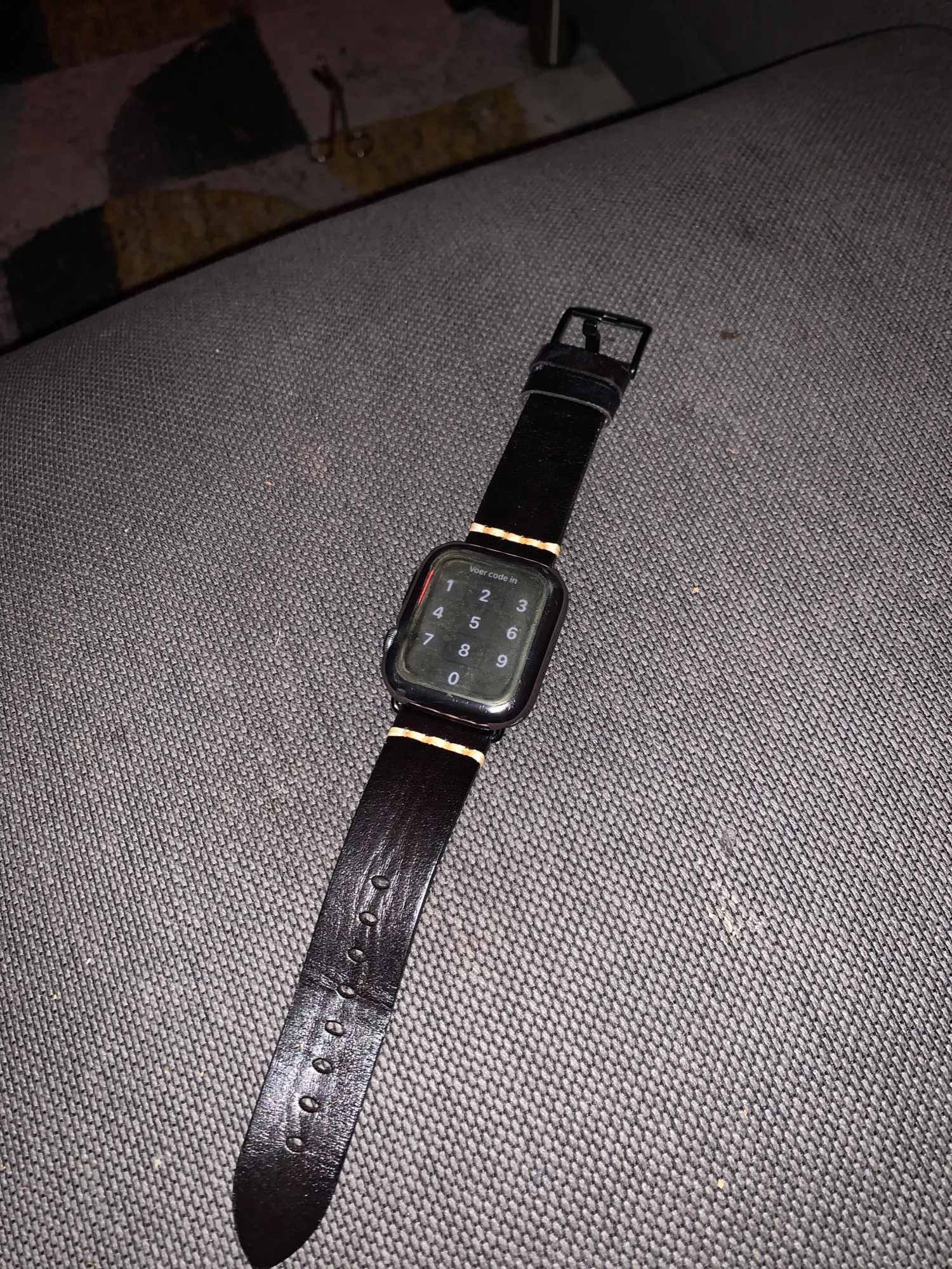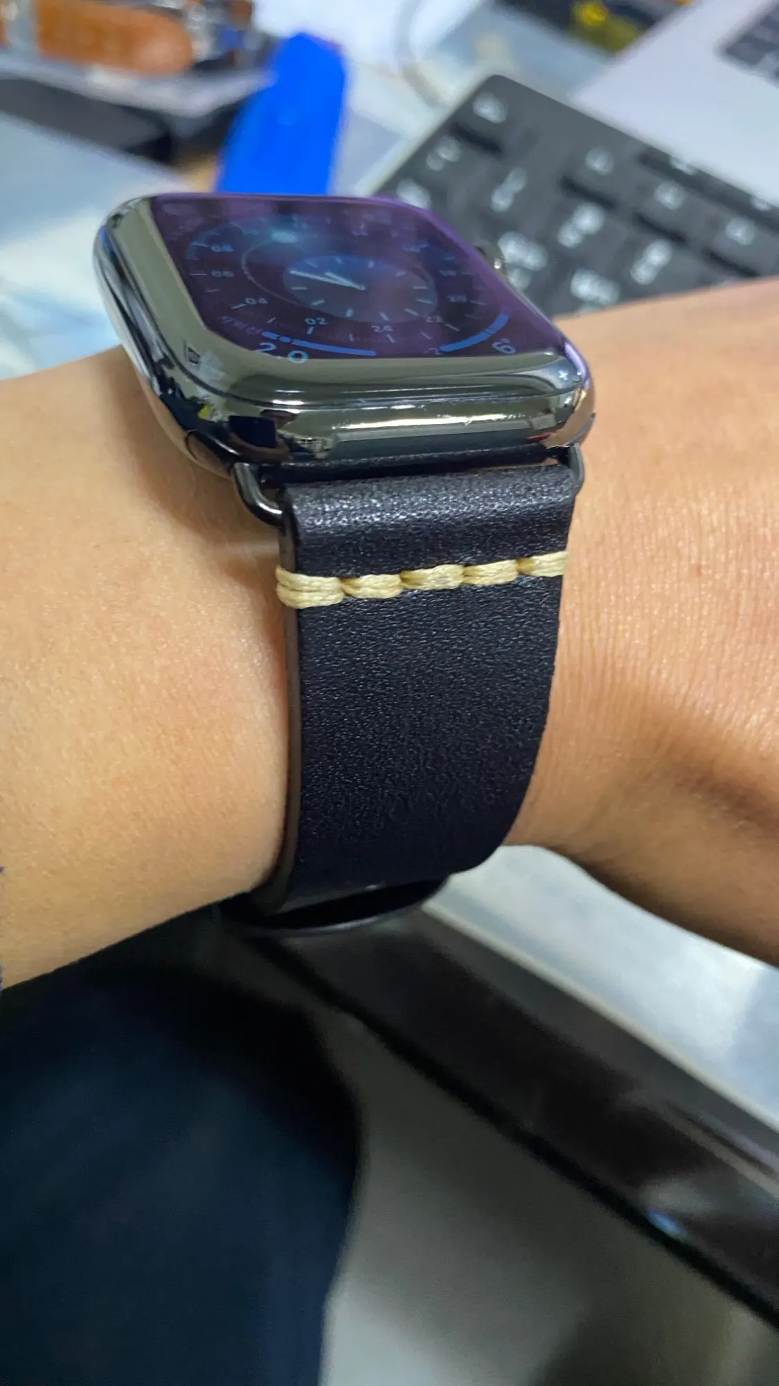 Натуральная кожа. Красивый синий цвет. Идеально подходит для iWatch 6. Одна точка: все размеры подходят всем. И немного меньше для мужчин. Все равно подходит, но немного длиннее, было бы лучше.