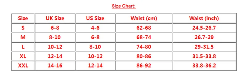 Размеры Размер Великобритании Размер США Талия (см) Талия (дюймы) S 6-8 4-6 62-68 24,5-26,7 М 8-10 6-8 68-74 26,7-29 L 10-12 8-10 74-80 29-31,5 XL 12-14 10-12 80-86 31,5-33,8 XXL 14-16 12-14 86-92 33,8-36,2