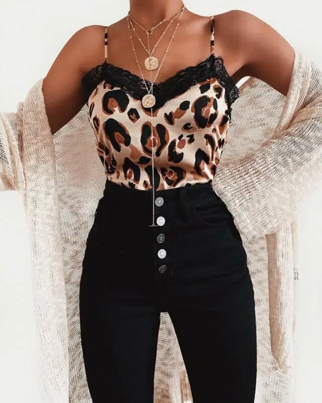 Женский топ без рукавов, Шелковый топ с леопардовым кружевом, Свобо...