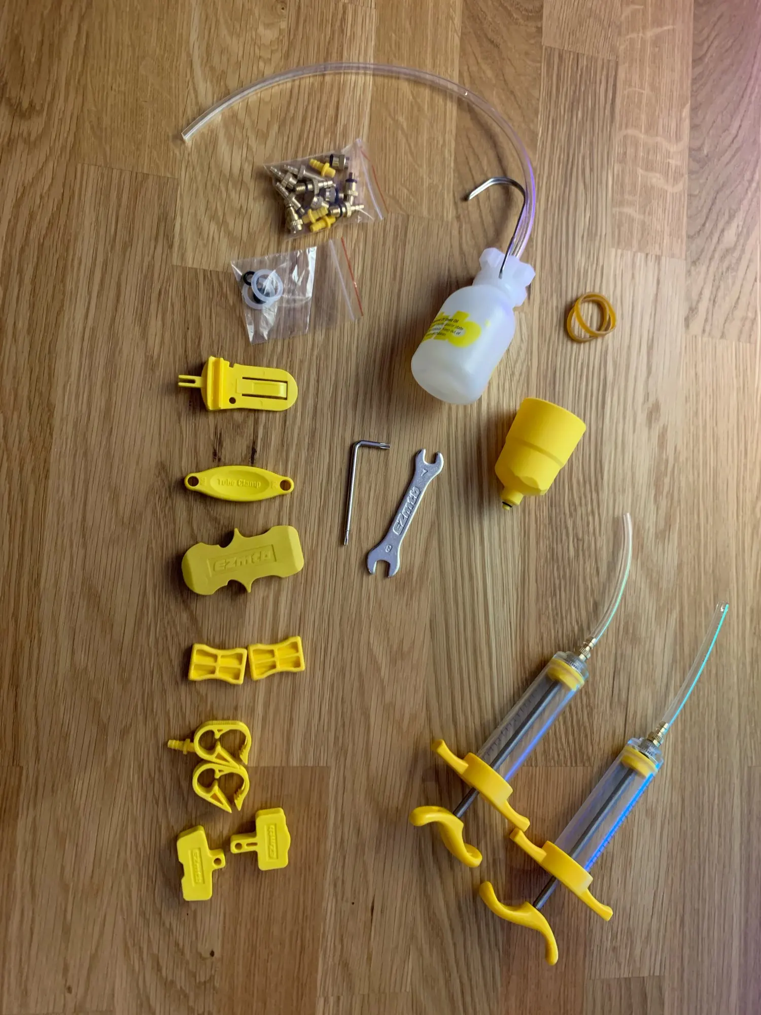 Отличный набор, есть все что нужно, прокачал свои тормоза минут наверное за 15 с первого раза, штуцера закручиваются ровно, без перекоса и закусывания орингов. Единственный минус, это то что трубку со штуцера снять у меня не получилось, т.е. ее либо отрезать, либо докупить еще патрубков и под каждый вид тормоза использовать разные штуцера.
