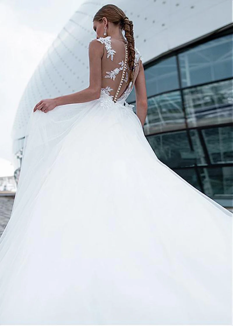 Пляжные свадебные платья с О-образным вырезом, с аппликациями в виде кружева трапециевидной формы Тюль пуговицы богемные Свадебные платья для принцесс 2020