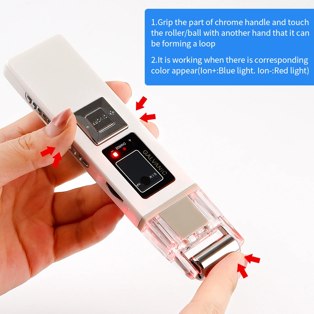 3. Захватите часть хромированной ручки и коснитесь ролика/шарика другой рукой, чтобы он мог образовать петлю, он работает, когда соответствующий цвет появится на прозрачной части ролика/мяч тростника. (Ион +: синий свет, Ион-: красный свет)