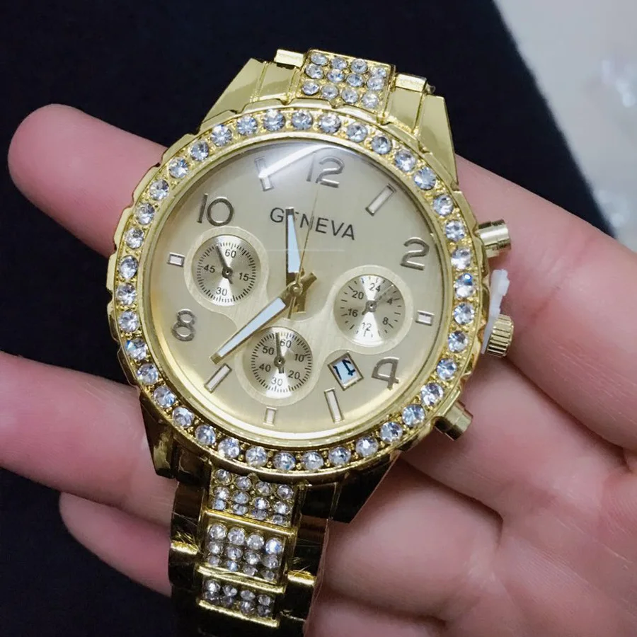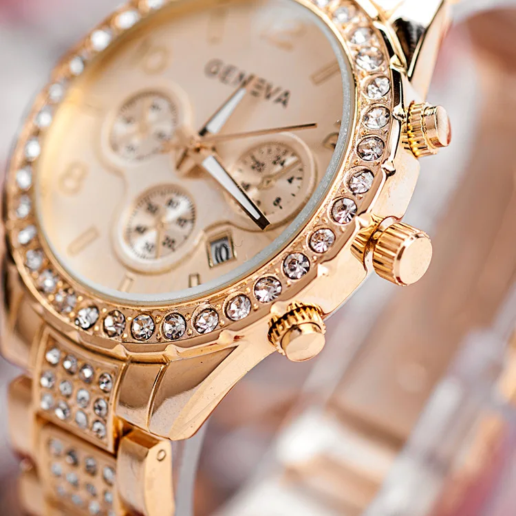 Часы женские кварцевые со стразами, модные роскошные Брендовые повседневные Geneva со стразами, золотистые стальные
