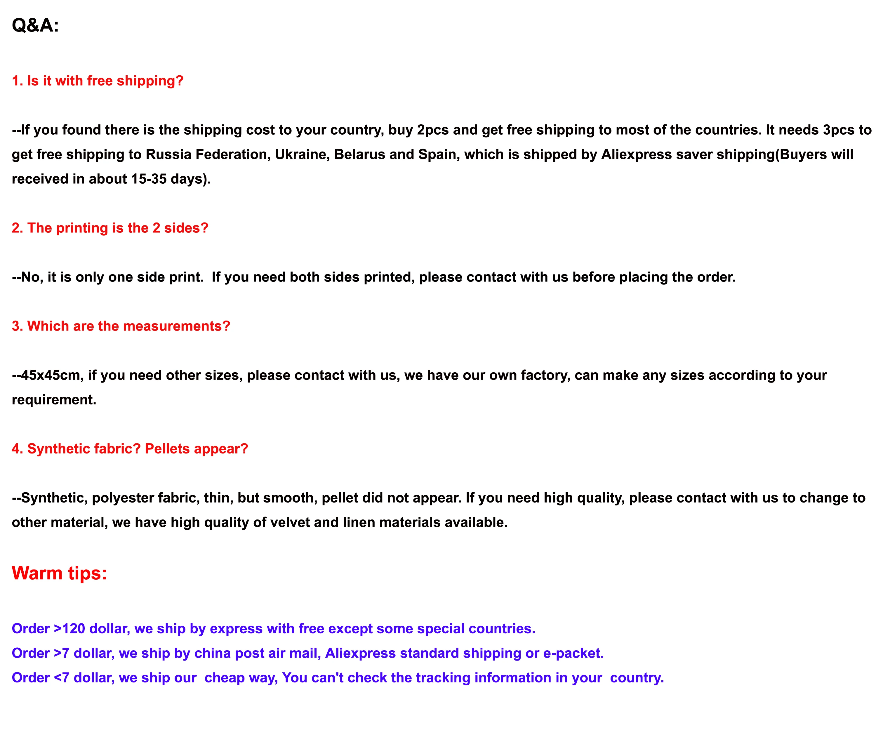 1. Заказы обрабатываются в течение 1-5 дней после оплаты и проверки. 2. Почта Китая обычный Small Packet Plus не имеет международного номера отслеживания, который нельзя отслеживать, когда посылка покидает Китай. 3. Для более быстрой и безопасной доставки мы рекомендуем вам выбрать доставку заказной авиапочтой Почта Китая, ePacket или стандартной доставкой AliExpress 4. Мы организуем доставку в соответствии с адресом, который предоставляет покупатель, поэтому, пожалуйста, подтвердите и проверьте указанные Вами адресные реквизиты на Aliexpress. 5. Если вы не получили свой товар в течение 60 дней, пожалуйста, свяжитесь с нами. Мы проверим его для вас. Отзывы 1. Ваше удовлетворение и положительотзывы в очень важны для нас. 2. Пожалуйста, оставьте положительный отзывы в и 5 звезд, если вы удовлетворены товарами. Мы будем признательны, если вы сможете разместить фотографии товаров. 3. Если у вас есть какие-либо вопросы о продукции или наших услугах, пожалуйста, свяжитесь с нами, прежде чем оставлять отрицательотзывы в. Мы сделаем все возможное, чтобы решить любые вопросы и предоставить Вам лучшее обслуживание клиентов. О возврате и возврате средств 1. Пожалуйста, свяжитесь с нами, прежде чем возвращать товар, который является дефектным или неправильным. 2. Пожалуйста, храните возвращаемый товар в неиспользованном состоянии и сохраните оригинальную упаковку, включая коробку и бирки. 3. Пожалуйста, верните дефектный или неправильный товар в течение 7 дней после получения. 4. Мы не допускаем возврат средств или обмен из-за перемен и стоимость доставки не возвращается.