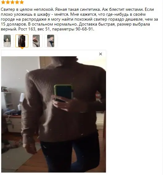 Свитер в целом неплохой. Явная такая синтетика. Аж блестит местами. Если плохо уложишь в шкафу - мнётся. Мне кажется, что где-нибудь в своём городе на распродаже я могу найти похожий свитер гораздо дешевле, чем за 15 долларов. В остальном нормально. Доставка быстрая, размер выбрала верный. Рост 163, вес 51, параметры 90-68-91.