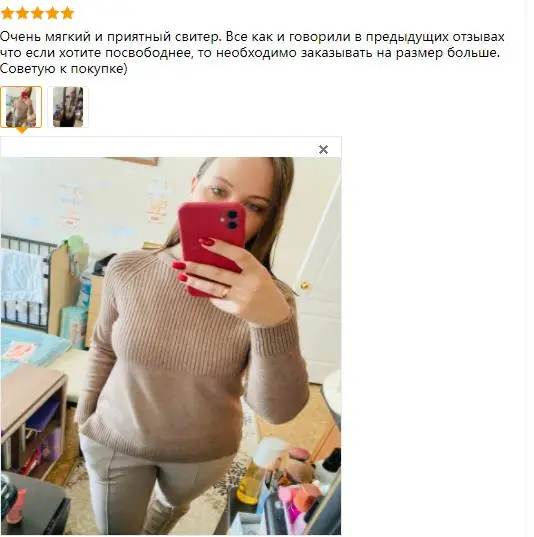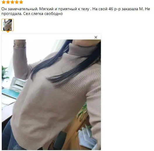 Soft and warm. Tight knitting. Quality and even seams. For the first time I ordered a garment from Ali, on recommendation . I'm glad that the thing is quality. The shape holds like a rag does not hang. My height is 167.