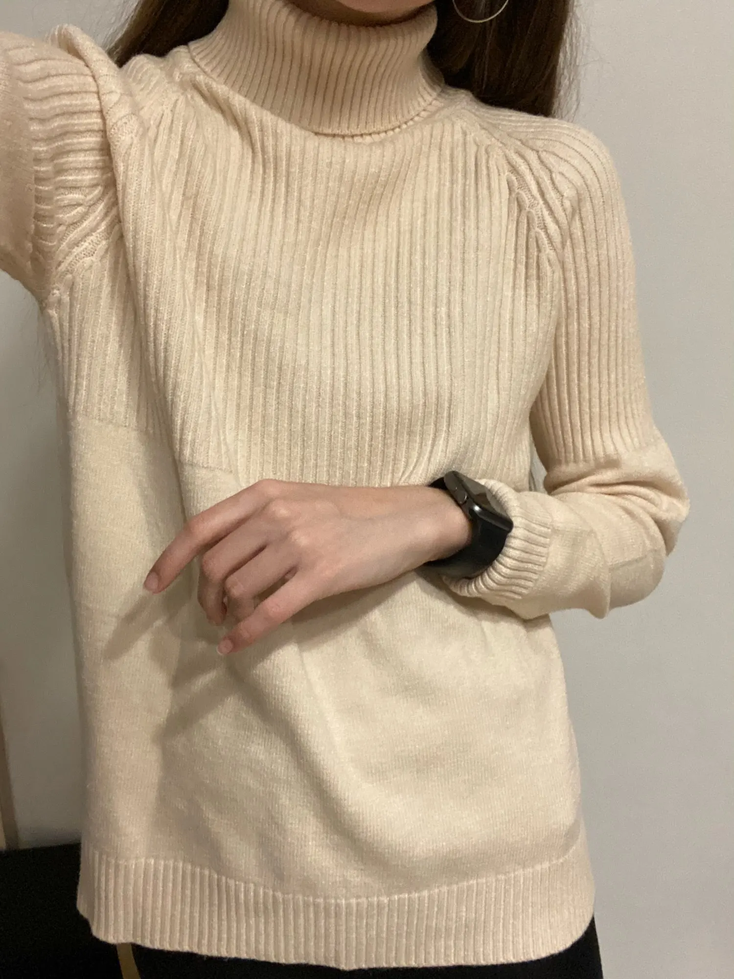 Приятный мягкий свитер, ни в коем случае не водолазка, так как вязка плотная и объемная, а ещё очень теплая. Был некоторый запах - выветрился на балконе за выходные. На рост 175 чуть короткие рукава. Горловина высокая, на изнанке нет ярлычков (бирка XL отдельно вложена в пластиковый зип-пакет). Как подарок приложена "ушастая" резинка для волос.