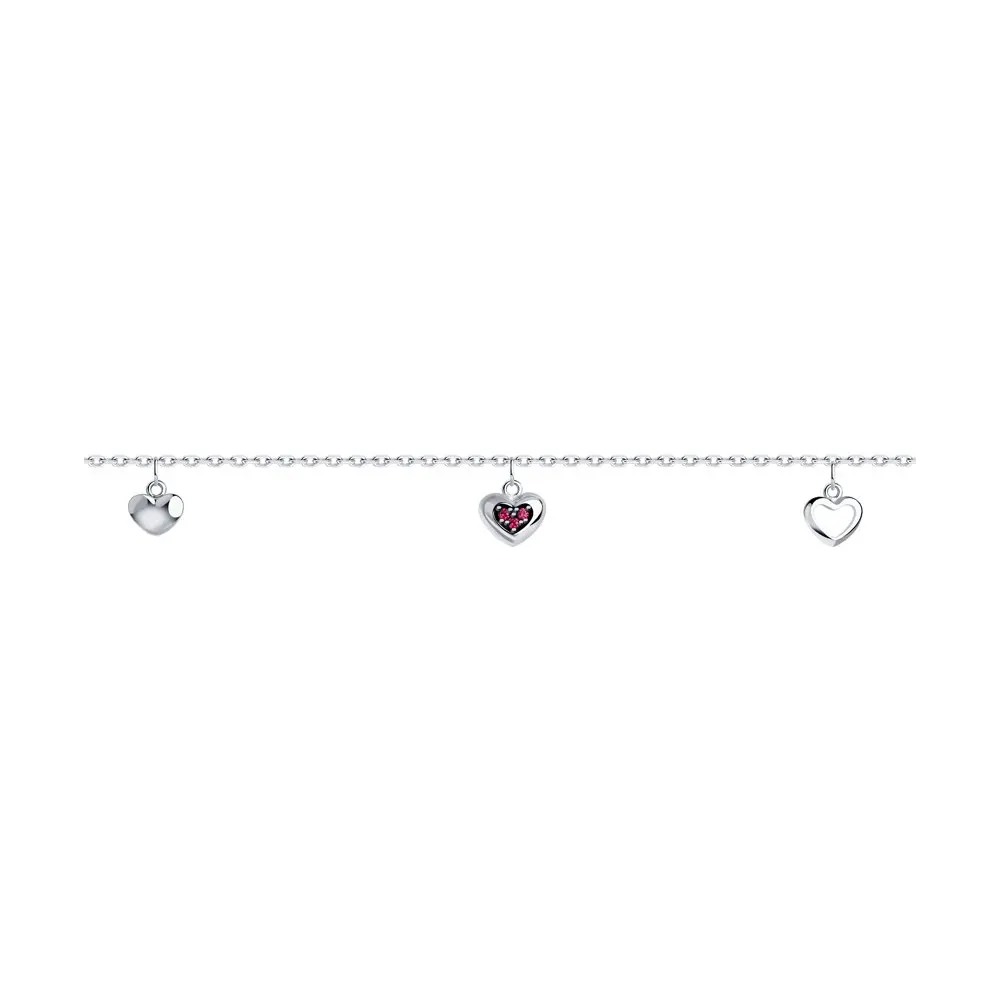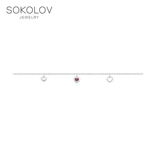 Браслет SOKOLOV из серебра с фианитамиНежный и романтичный дизайн браслета из серебра заставит ваше сердце биться чаще. Подвесные элементы выполнены в форме миниатюрных сердечек, форму которых на одном из них повторяет комбинация красных корундов. Купить браслет, олицетворяющий очарование юности, можно в подарок младшей сестре или любимой подруге, а также пополнить свою коллекцию украшений ярким приобретением по очень привлекательной цене.