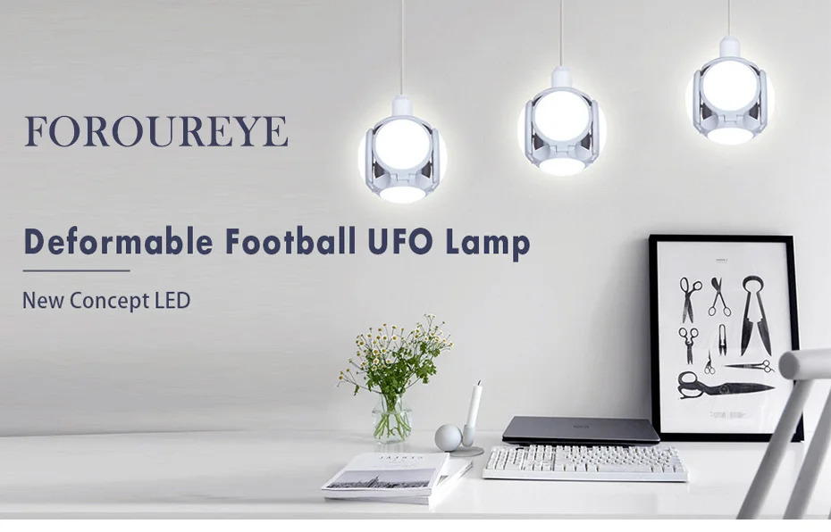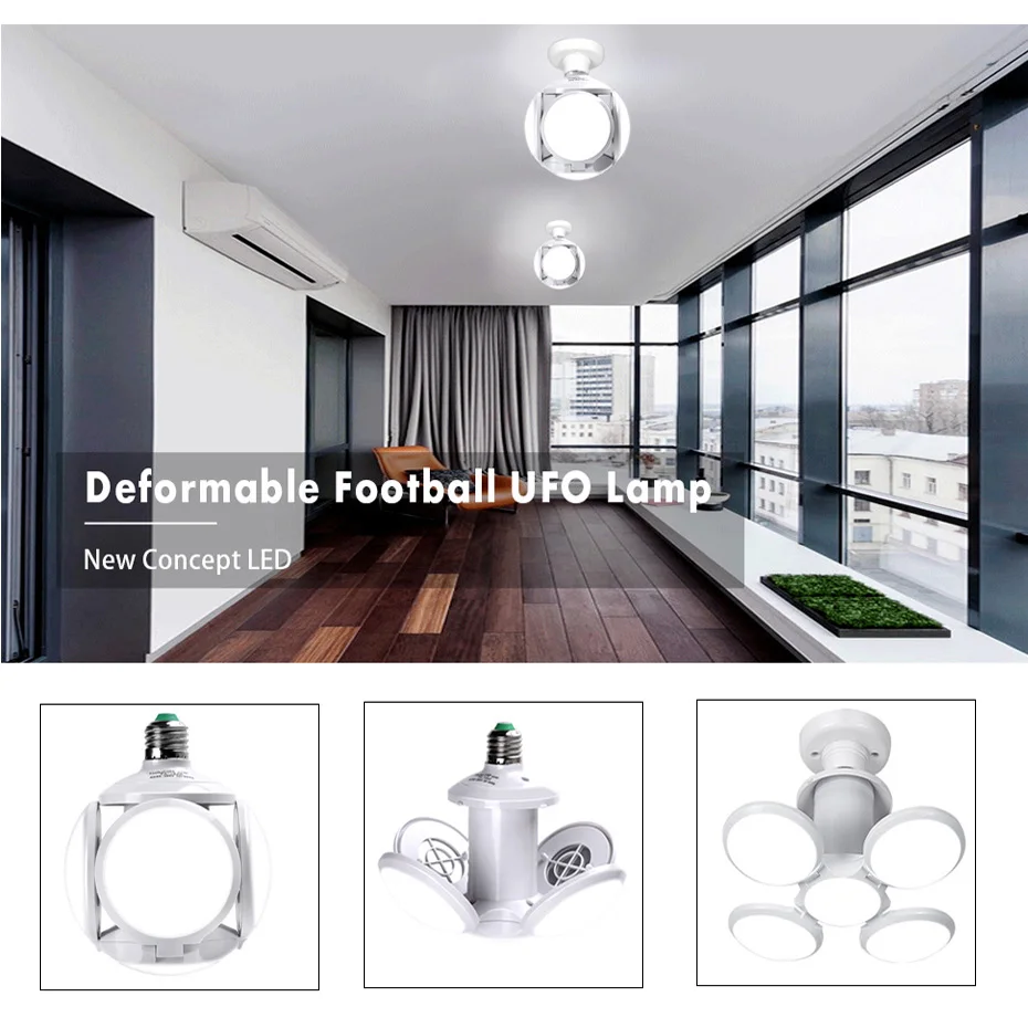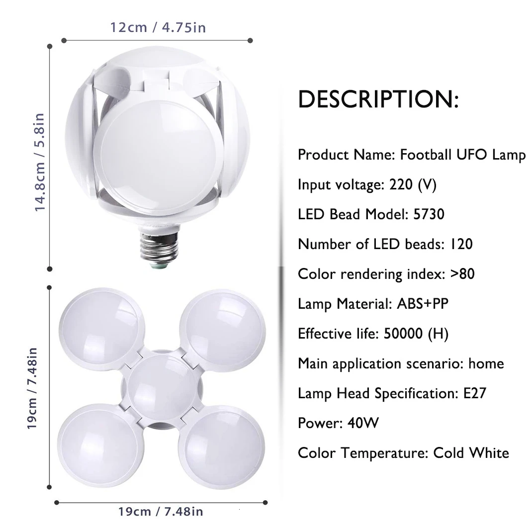 Футбольная лампа НЛОРазъем: E27Мощность: 40 ВтНапряжение: AC85V-265VМатериал: АБС + ППЦветовая температура: холодный белый 6500 КМодель светодиодного чипа: 120 шт * SMD5730Угол свечения: 360 градусовГарантия: 2 года