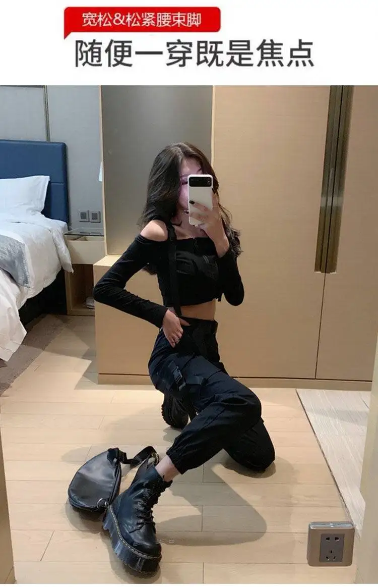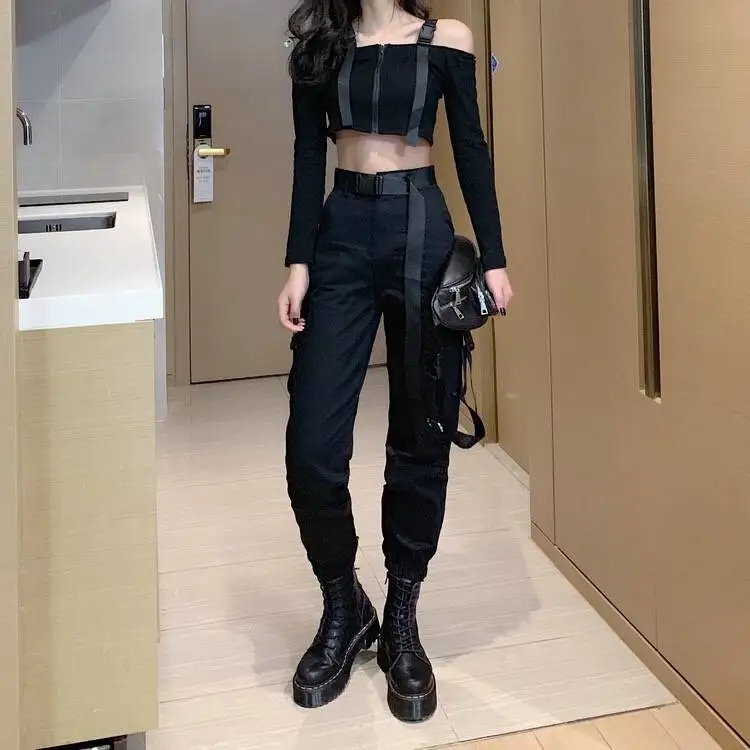 Женские черные брюки-карго с высокой талией, студенческие повседнев...
