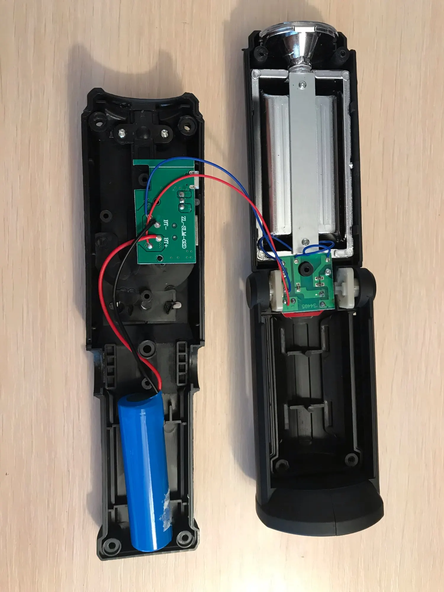 Доставка с Российского склада на 5й день в квартиру в Нерезиновой службой IML. Внутренний мир на фото. Немного поменялся спустя 3 года. Аккумулятор 18650 без маркировки, емкость тестируется пока, потом дополню. Аккумулятор без зашиты, при работе подключается напрямую к светодиодами через токозадающие резисторы. Ширма нет, но и стабилизации яркости тоже нет. Аккумулятор Может разрядиться в ноль и умереть. Советую поставить платку защиты. Потребление от полного аккумулятора COB диода 0,57 А (2,3Вт), круглого - 0,17 А (0,7 Вт). При заряде потребляет до 0,5 А от 5 В. Как павербанк без нагрузки на выходе 5.15 В, под нагрузкой 1.1 А напряжение просаживается до 4.75 В. В режиме заряда светодиод мигает красным, по окончании заряда - горит красным постоянно, в режиме павербанка горит зелёным постоянно.