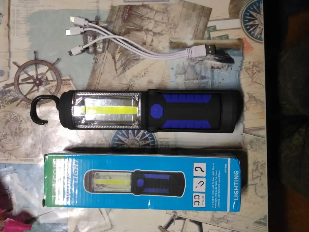 Быстрая доставка курьером до двери. Фонарь полностью соответствует описанию , в комплекте шнур который можно использовать для зарядки гаджетов и самого фонаря. Света вполне достаточно. Есть два режима работы фонаря. Имеется два магнитных крепления и крючек.