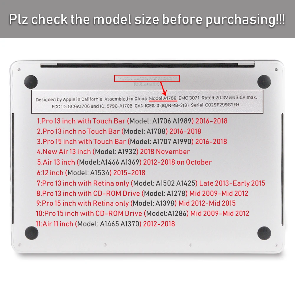 1. Пожалуйста, проверьте размер вашей модели в нижней части ноутбука, например "A1xxx" перед покупкой.